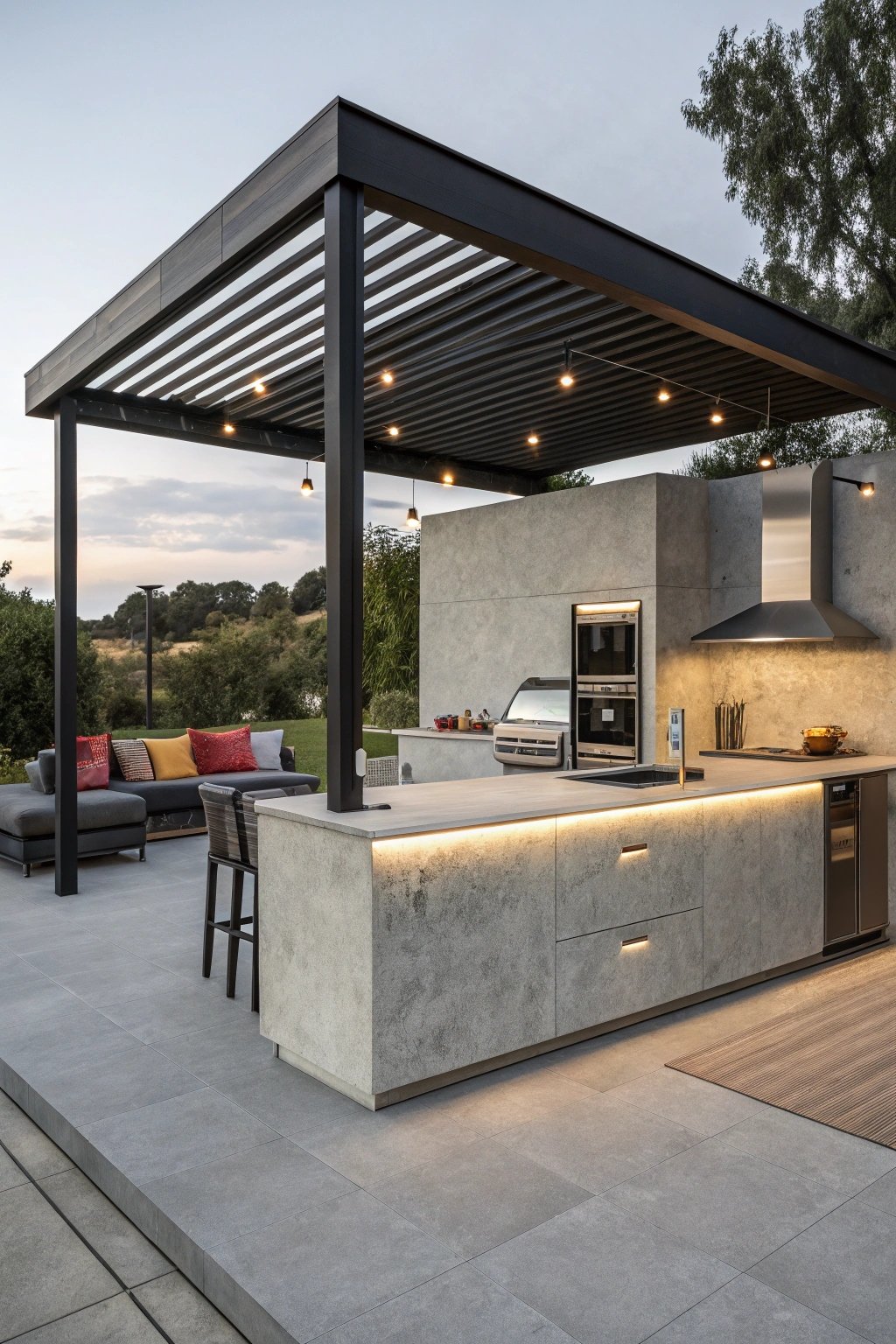 A monolithic concrete bar spans beneath a flat steel pergola. The palette is restrained: poured-in-place concrete, black powder-coat, and smoked glass. Appliances tuck into a streamlined run—teppan plate, gas grill, and drawer fridge—while a hidden channel drains water.