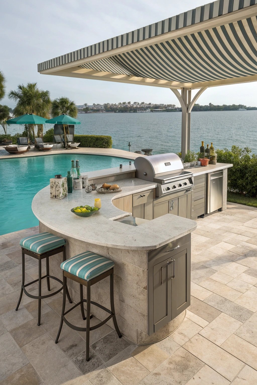 A curved counter follows the pool edge, merging bar and cook station. Quartzite counters resist splash and sun, while marine-grade cabinetry protects storage.