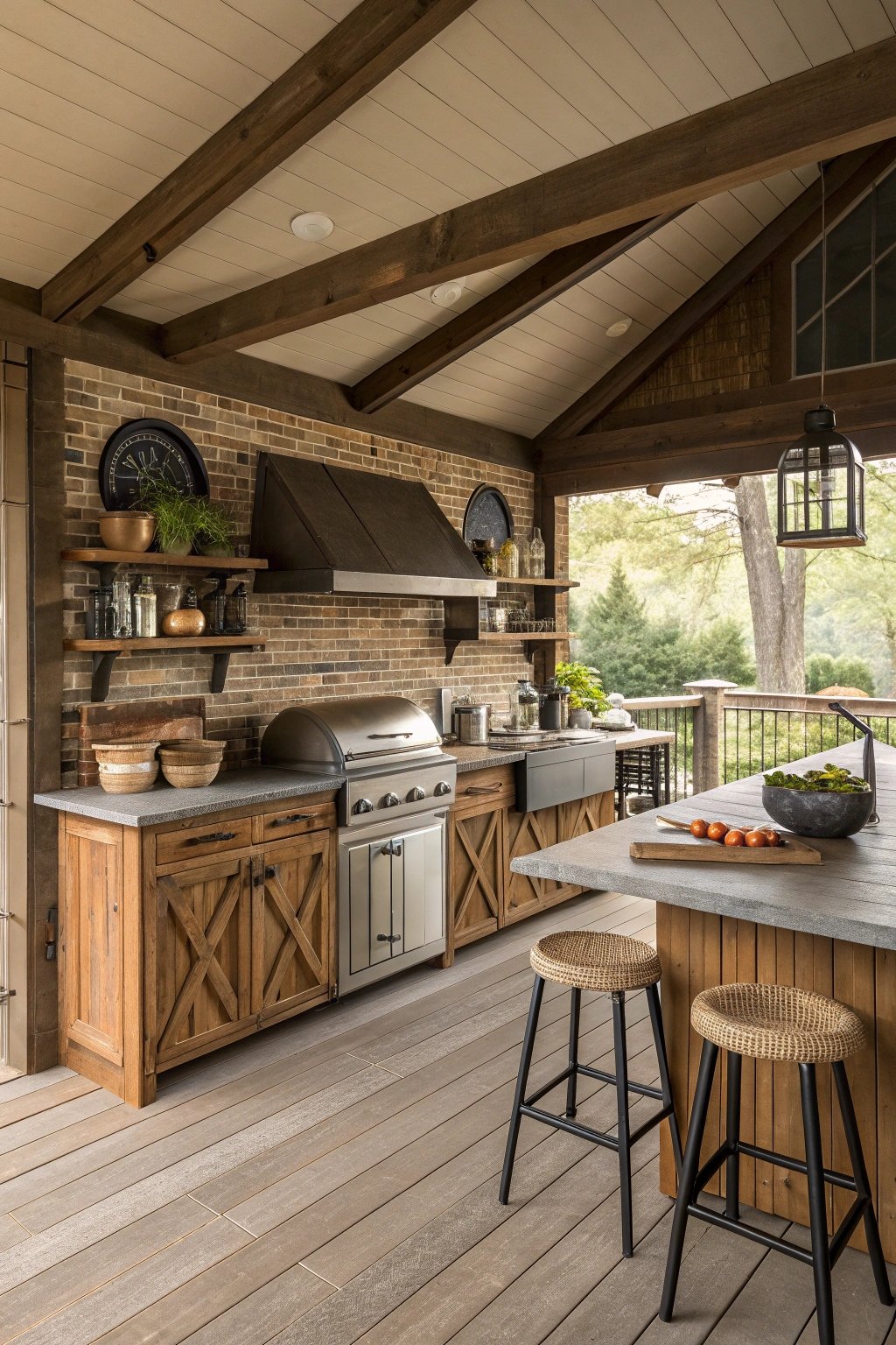 A gabled porch shelters a warm, tactile kitchen: reclaimed barn-wood cabinetry, honed soapstone counters, and a brick veneer wall behind a large grill and smoker.