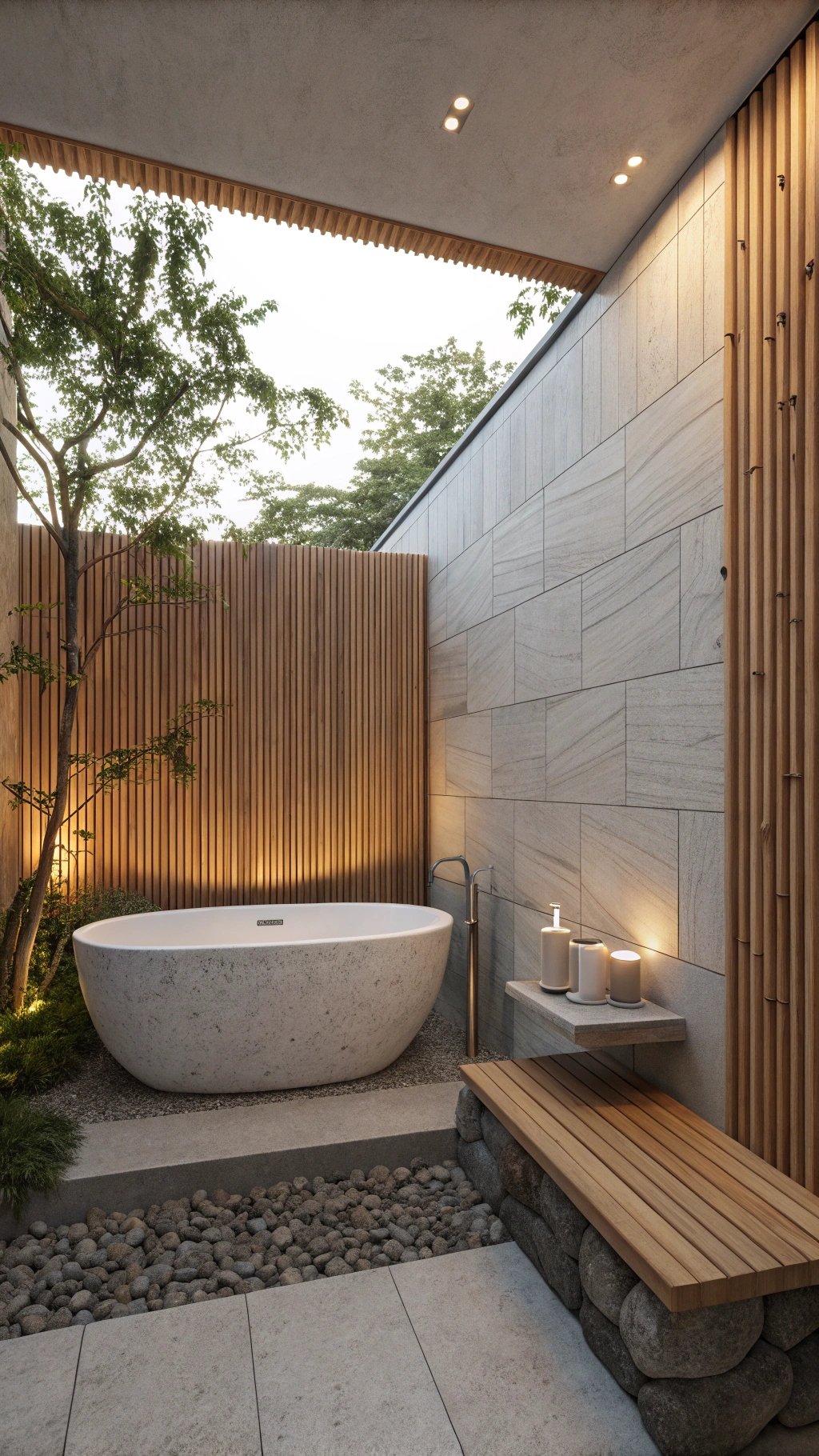 Add a perimeter ceiling graze to animate the texture at night. The bath looks taller, crafted, and highly photogenic while remaining simple to clean.