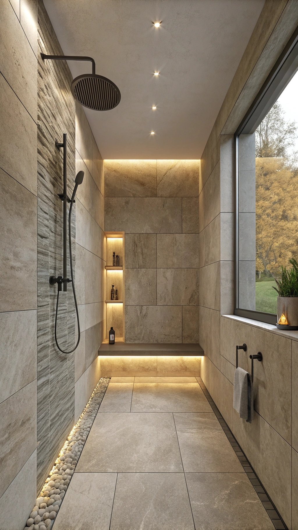 Repeat one material three times—floor, bench face, and curb or ledge—so the envelope reads unified. Color-match grout to tile and specify anti-slip matte for safe footing.