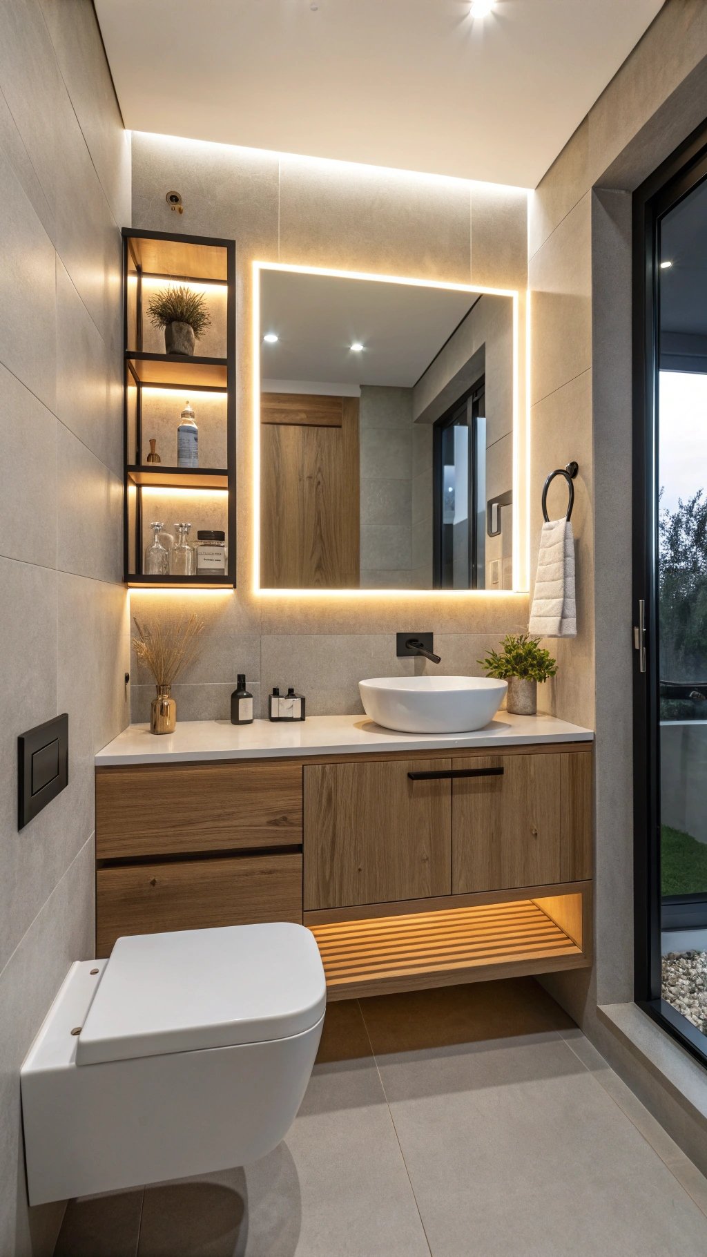 Install a toe-kick LED under the vanity for a subtle night path and echo the floating language with a shallow shelf above the splash zone instead of bulky medicine cabinets.