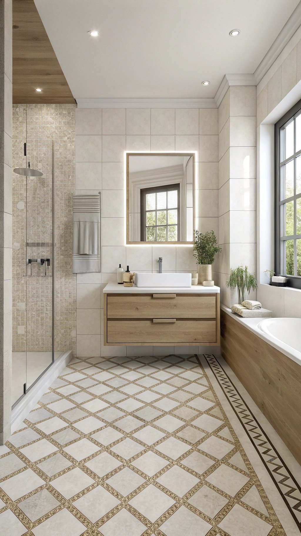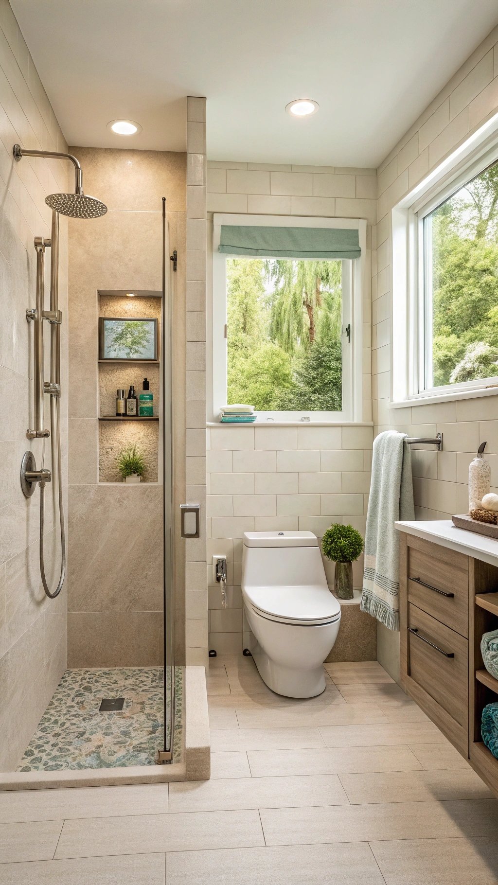 Comfort is luxury in a compact bath. A curbless shower, slip-resistant tiles, lever handles, and a wall-hung WC improve access for all ages.