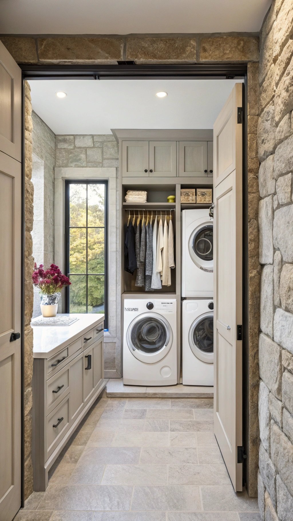 In small homes, a hidden laundry stack inside the bathroom adds big-life convenience. Tuck a washer/dryer behind paneled doors, add a folding shelf above, and include a pull-out rail for drip-dry items.