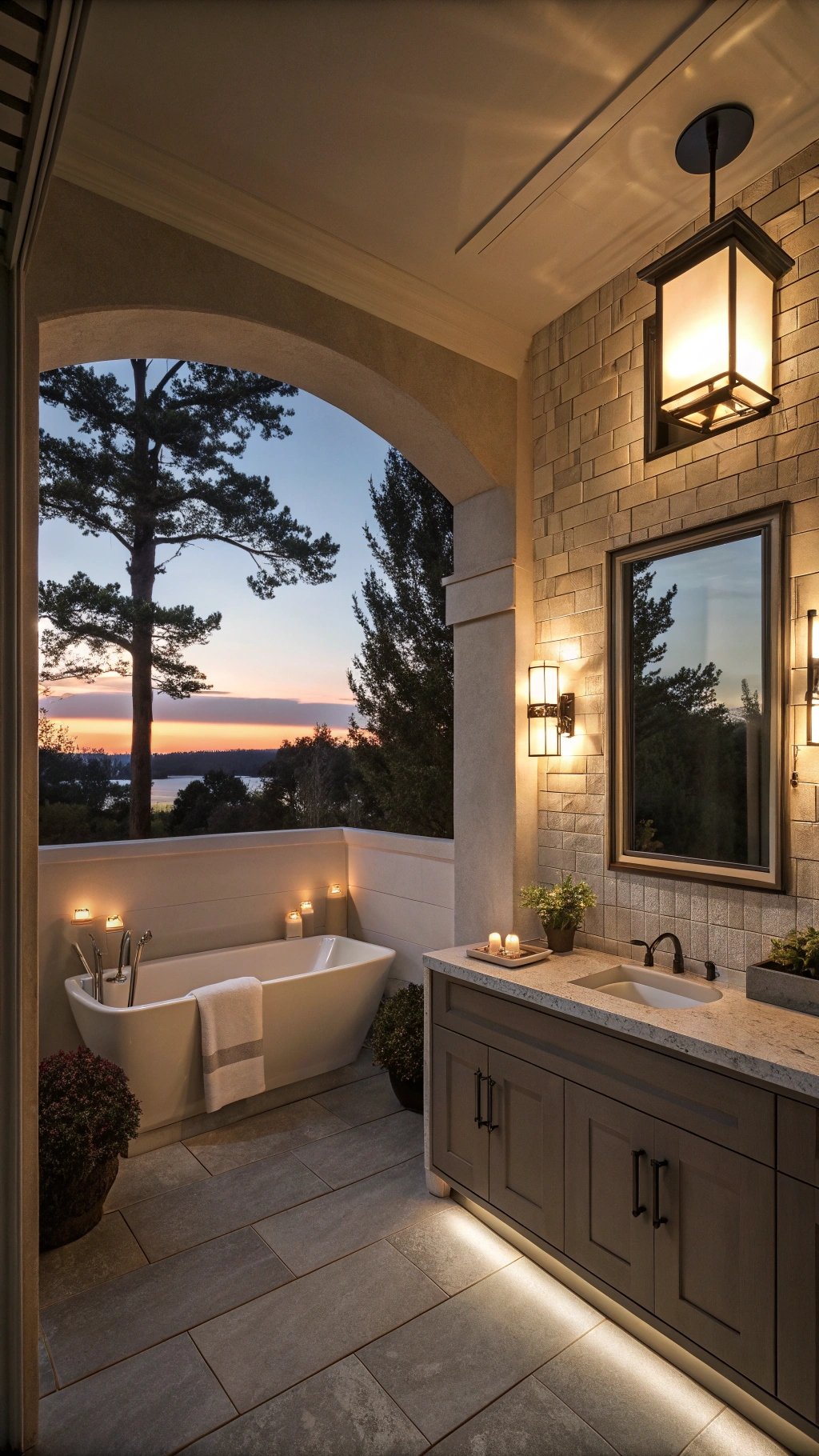 Keep surrounding tile subdued to let reflection and glow carry the décor. The room shifts effortlessly from bright daytime utility to cozy evening calm.