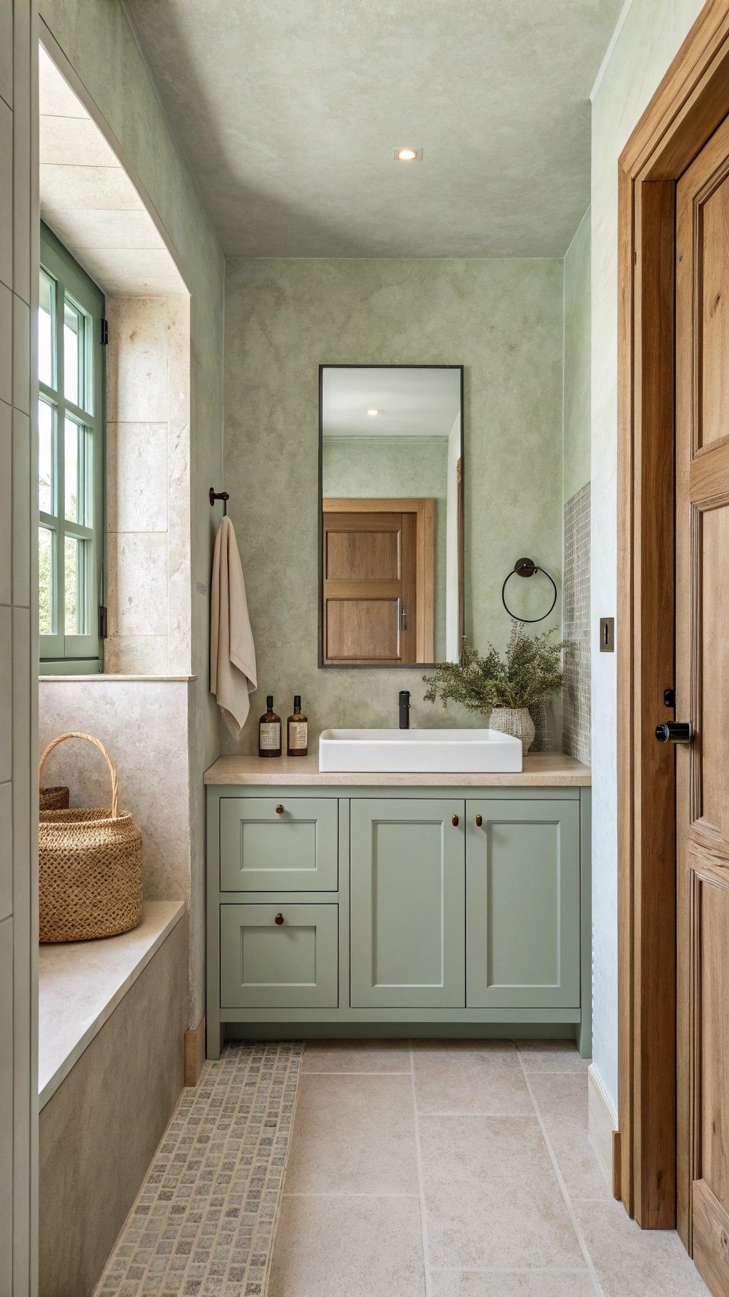 Create depth through sheen shifts: matte walls, satin vanity fronts, and a honed top. Repeat a single oak note in a frame and a small stool for cohesion.