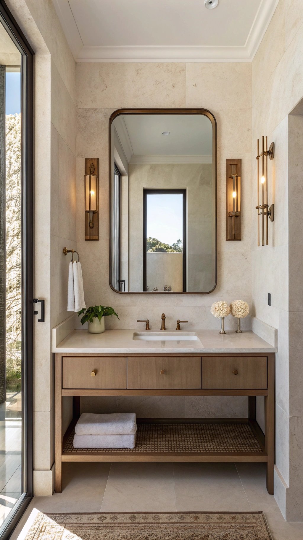Backlight the mirror on a dimmer so it doubles as a nightlight, and repeat the bronze tone in one tiny accessory—a frame or tray—for cohesion.