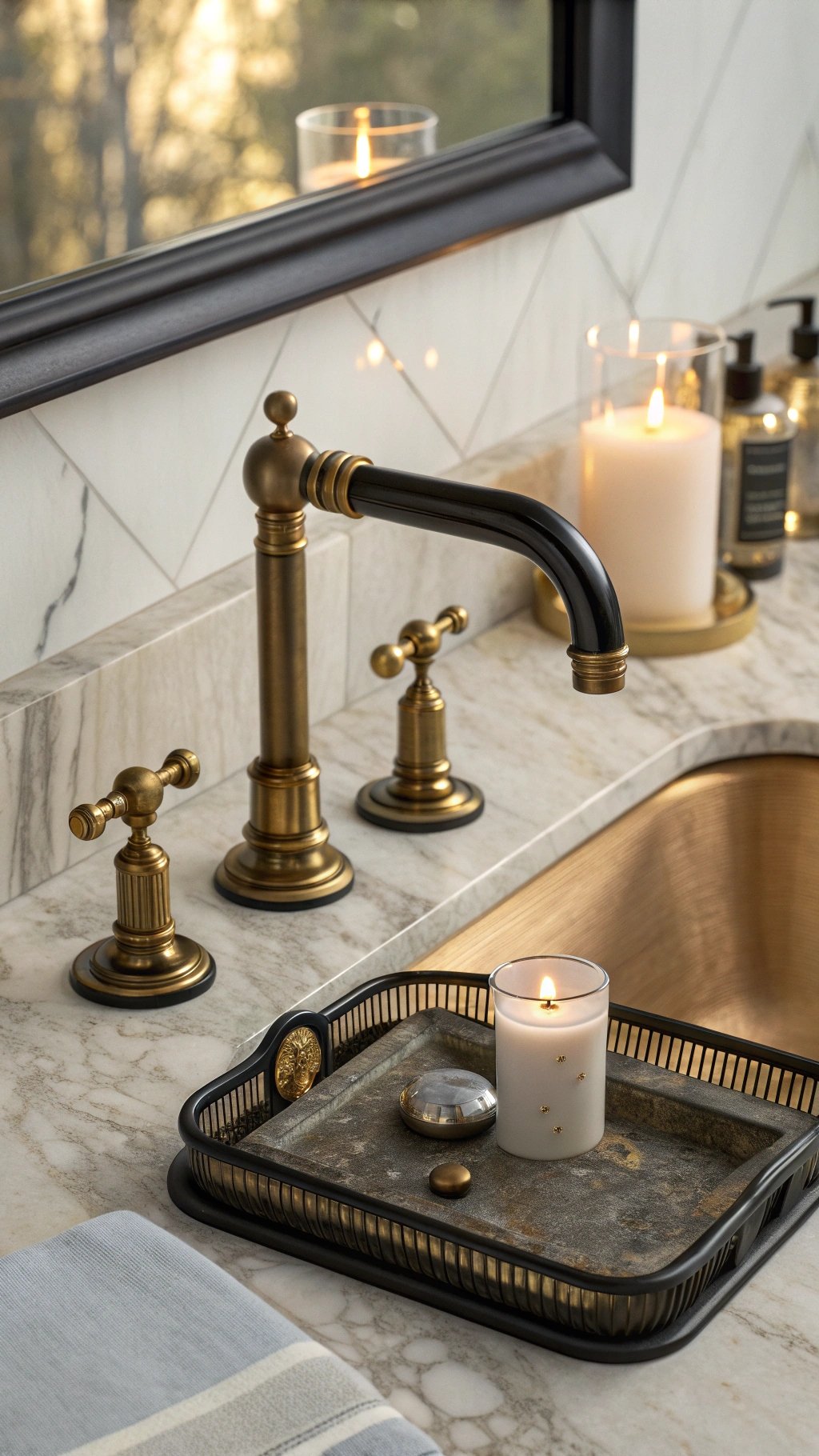Use an antiqued mirror tray to bounce candlelight at night without introducing a new finish. Match screw heads and backplates to your chosen metals to reduce visual noise.