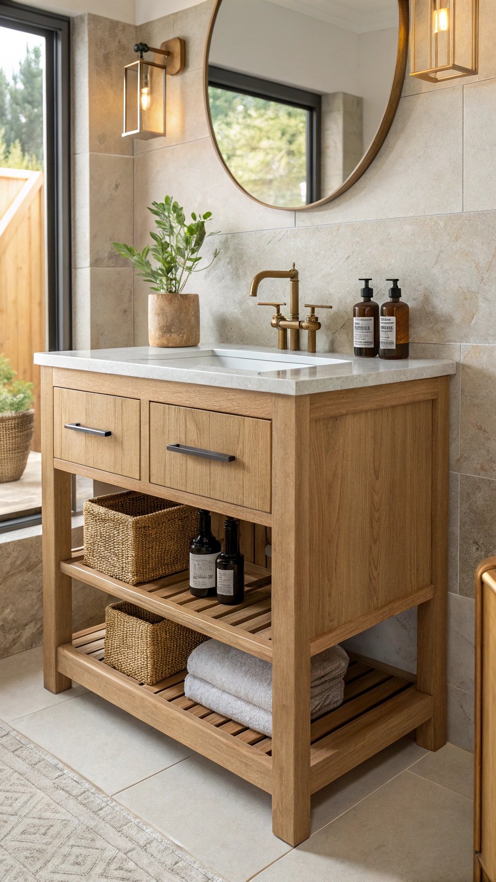 With disciplined styling—a soap block, a branch in water—your compact bath feels serene, elevated, and surprisingly easy to keep spotless.