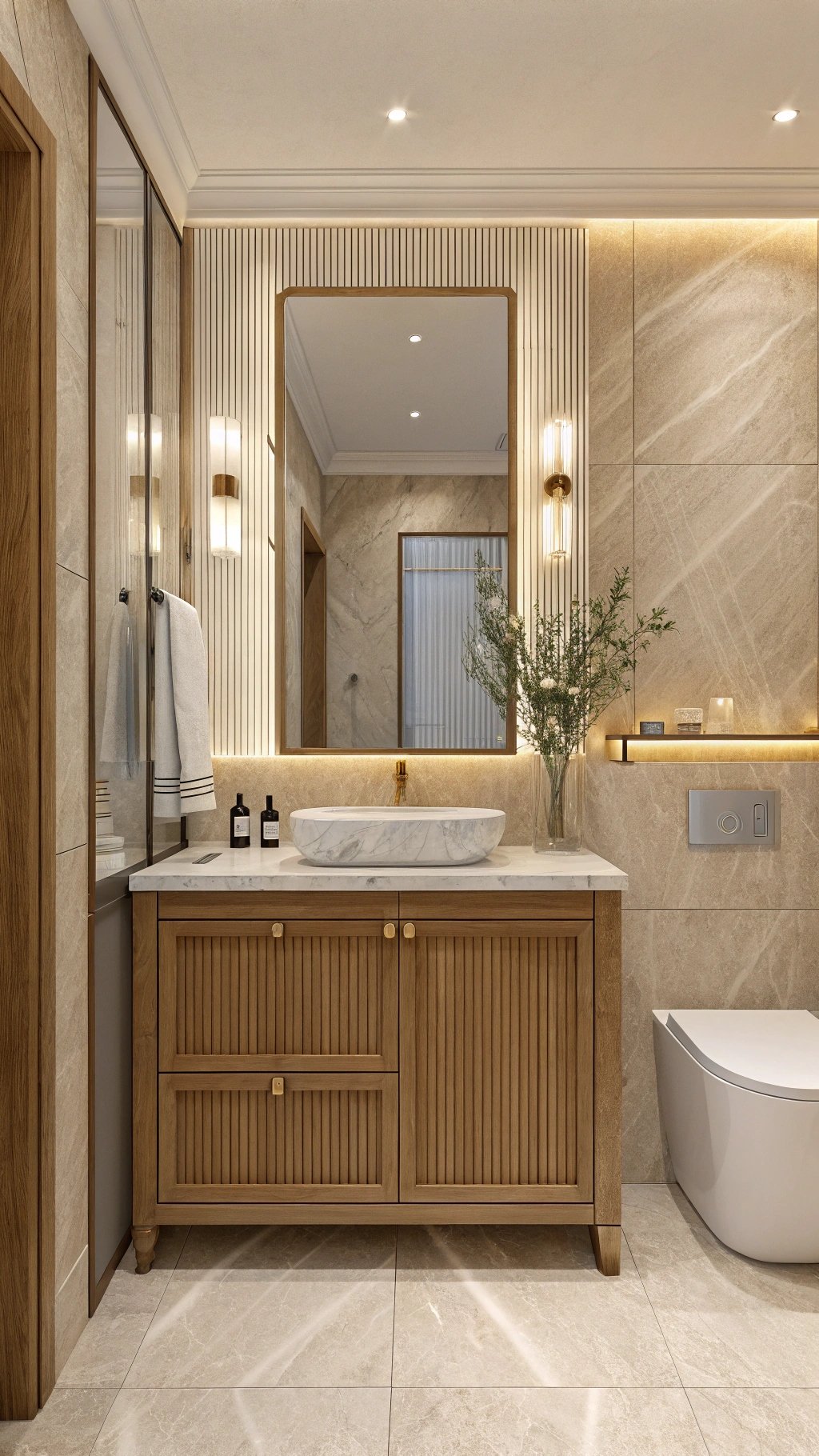 Repeat the vertical cue in three places—vanity, shower panel, and a slim wall behind the WC—so the gesture feels deliberate.