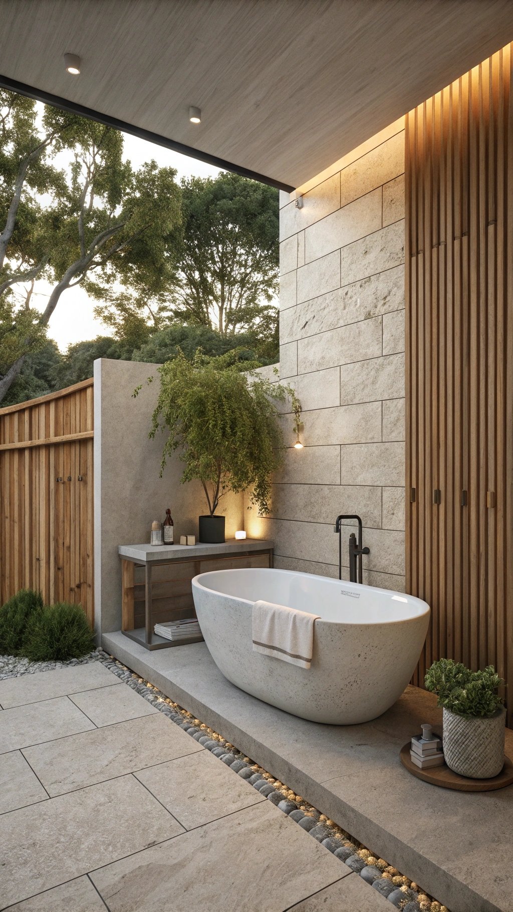 Frame the tub with limewash or a slatted cedar panel for texture, then aim a dimmable picture light at a petite artwork opposite.