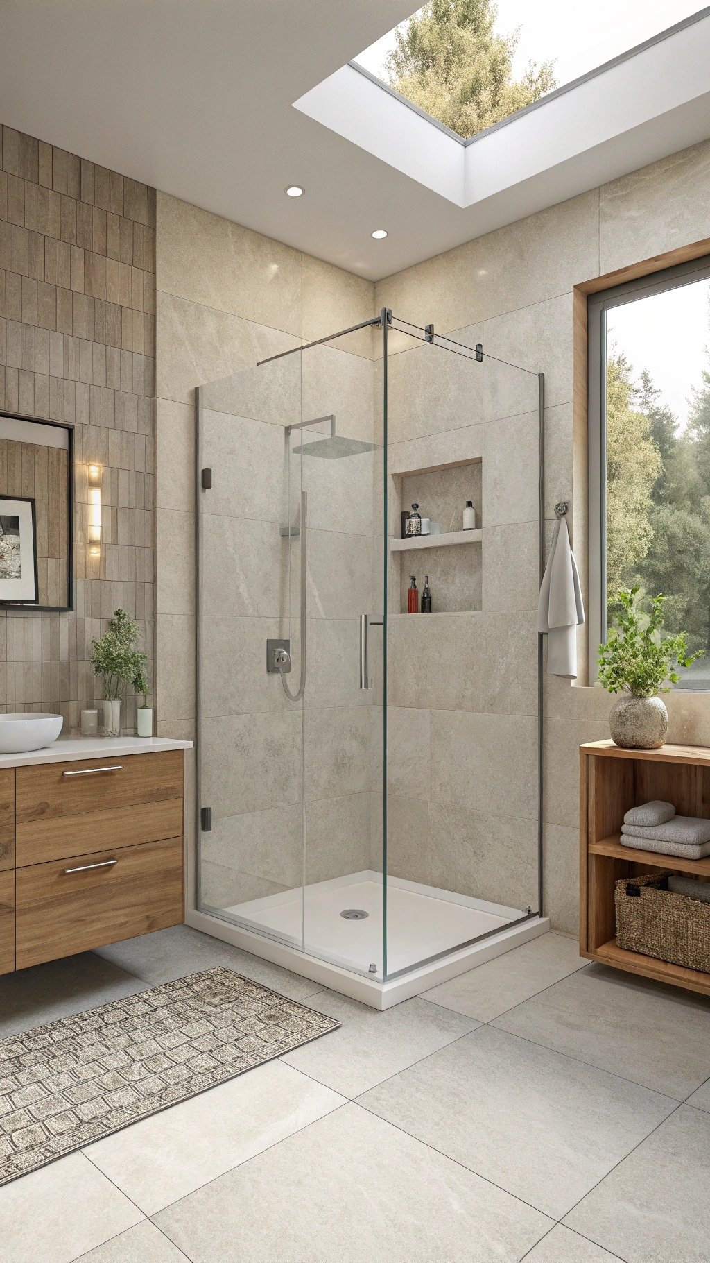 Keep the shower base curbless where possible, and run the same floor tile into the stall to avoid visual breaks. A single, well-placed niche aligned to grout lines controls bottles without adding bulk or clutter.