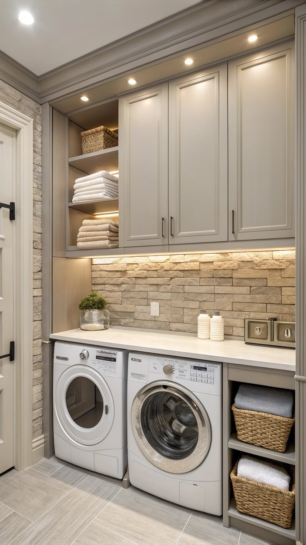 When space is scarce, tuck a stacked washer/dryer behind paneled doors inside the bathroom. Add a folding shelf above and a pull-out rail for drip-dry items.