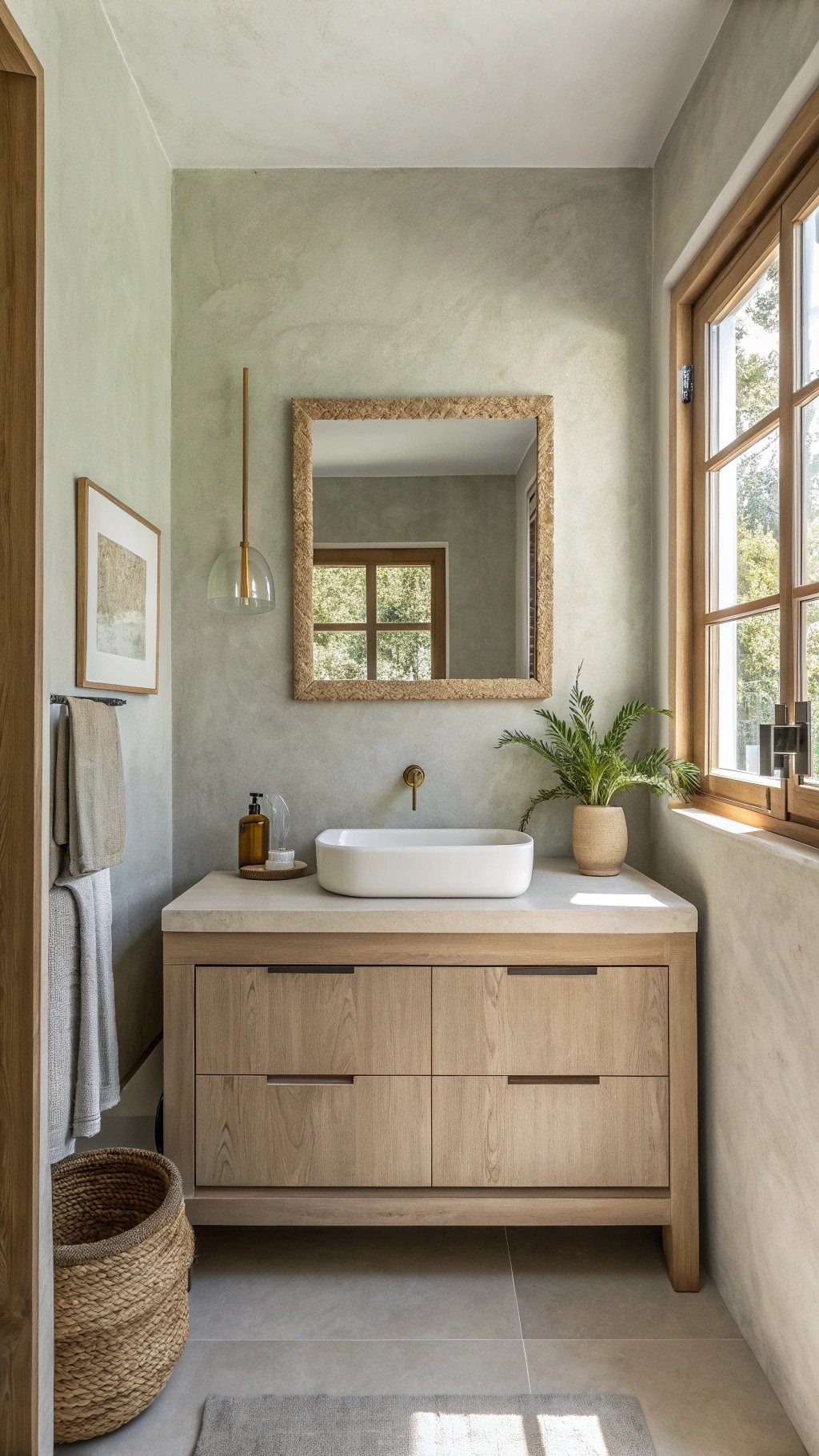 One pale hue from door to ceiling dissolves edges and makes a small bathroom read bigger. Use washable satin or microcement walls in warm white, mushroom, or pale sage.