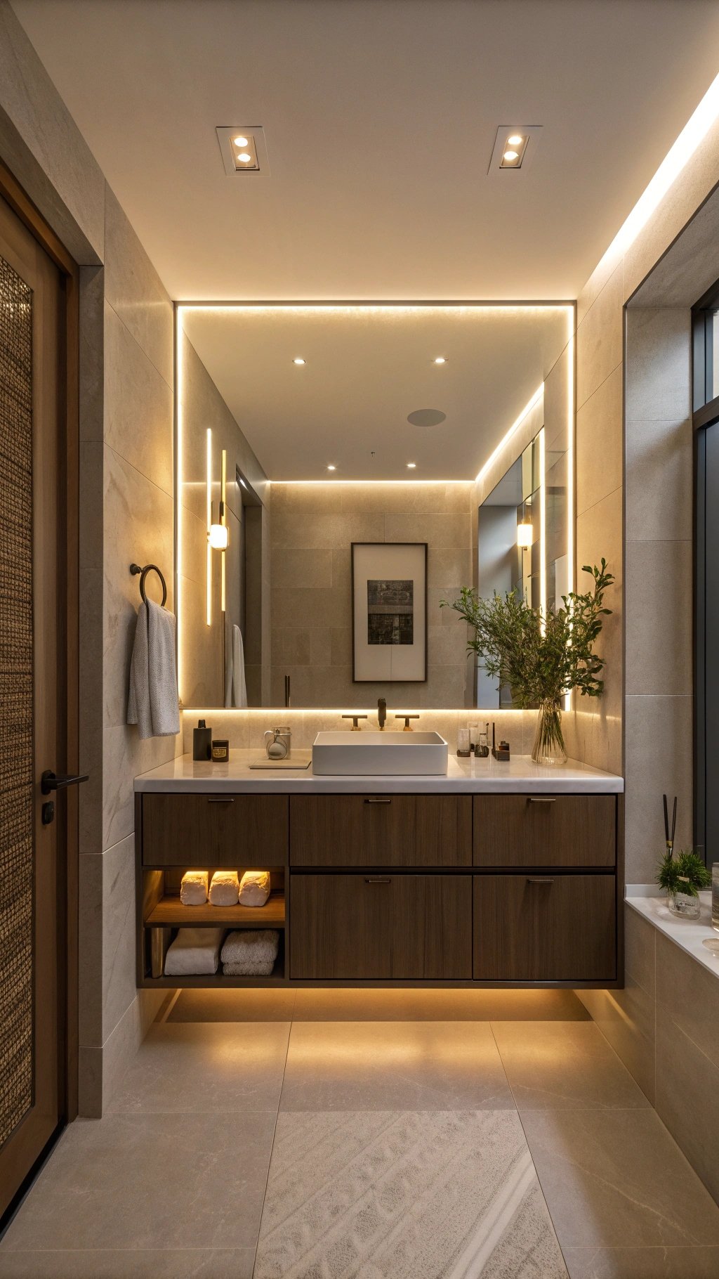 Great light enlarges small rooms. Combine ambient (slim ceiling fixture), task (face-height sconces), and accent (niche or under-vanity LED).