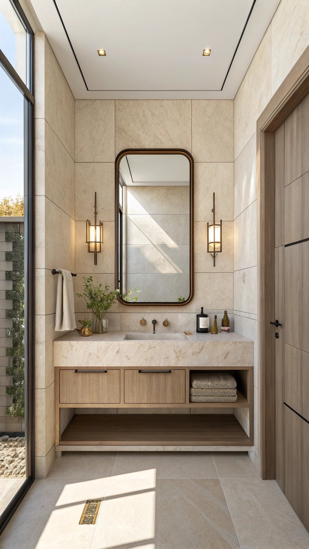Small bathrooms can’t spare counter space. Carve storage into walls: one niche in the shower, one at face height beside the mirror, and a long, shallow stone ledge above the splash zone.