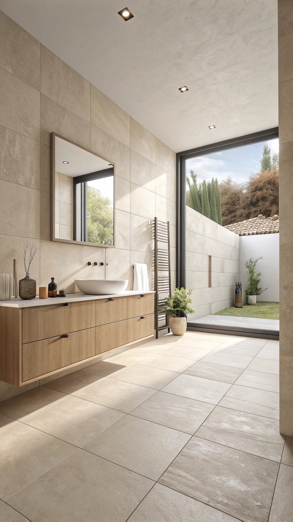 Large-format porcelain reduces grout and makes the floor read like one surface. Prefer a quiet, low-sheen finish that hides drips.