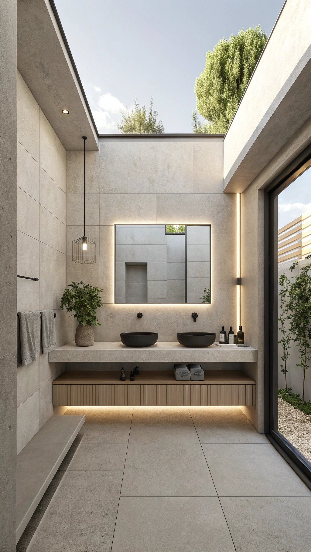 Color-match grout to tile, and use a matte anti-slip finish. The room feels architectural, accessible, and deceptively spacious.