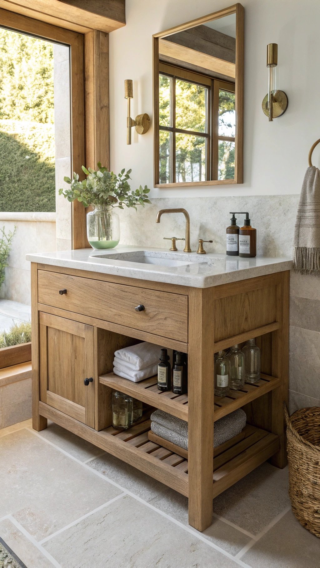Let the story show. Use a reclaimed shelf with visible joinery, labeled refill bottles in a niche, and a brass tap that will age gracefully.