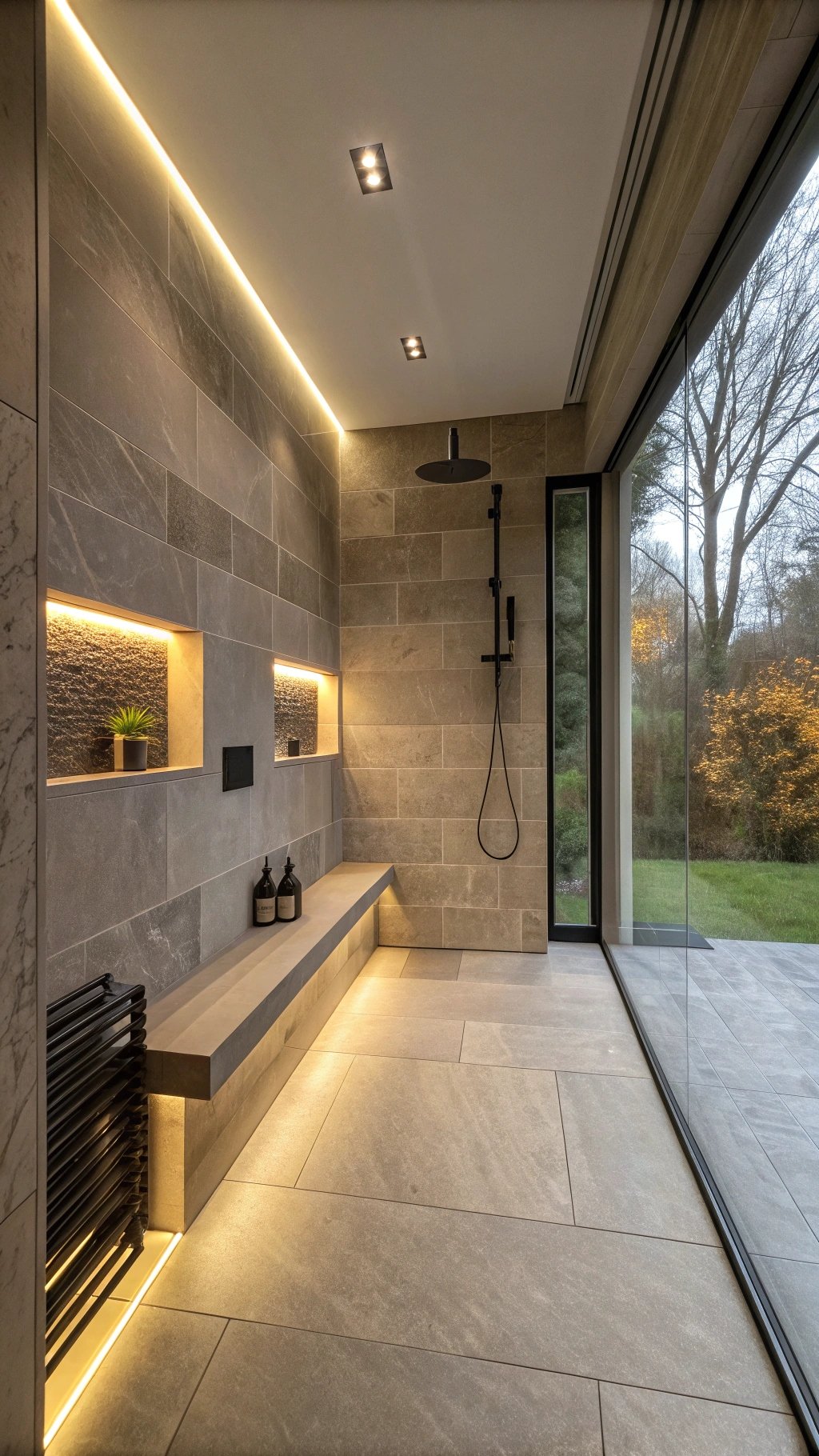 Ledges corral daily items while keeping surfaces wipe-clean. Finish niche interiors in stone or microcement to avoid busy grout lines.