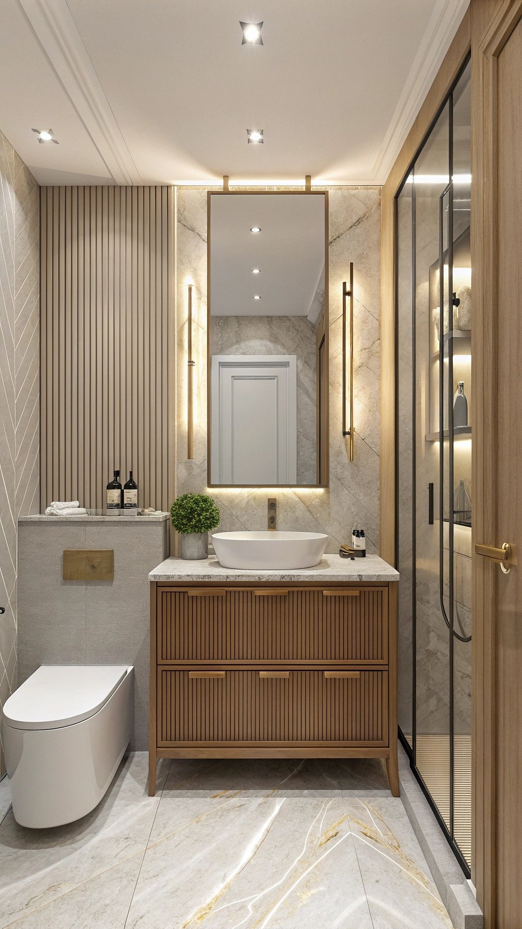 Repeat the vertical cue three times—vanity, shower glass, and a slim panel behind the WC—so the gesture reads intentional.