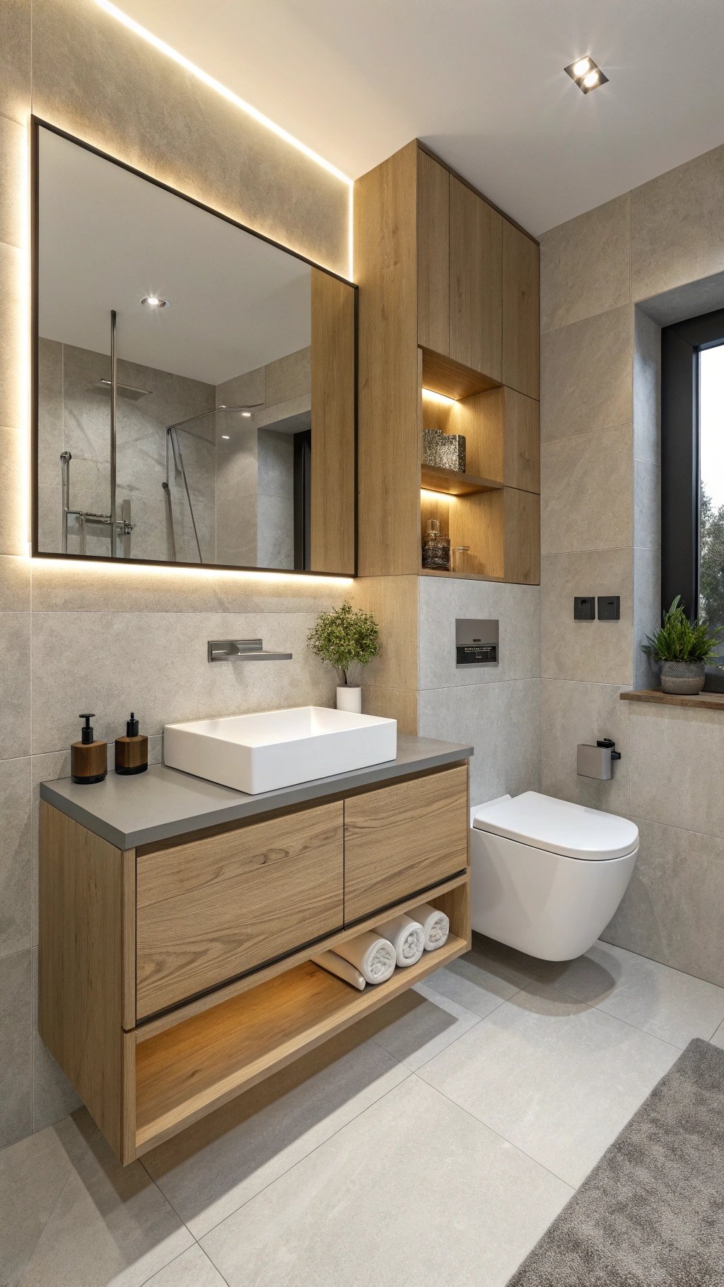 Create depth with sheen, not contrast: matte walls, satin vanity fronts, and a honed stone top. Add a single oak frame or ledge to warm the palette, and repeat that wood once more in a stool or tray.