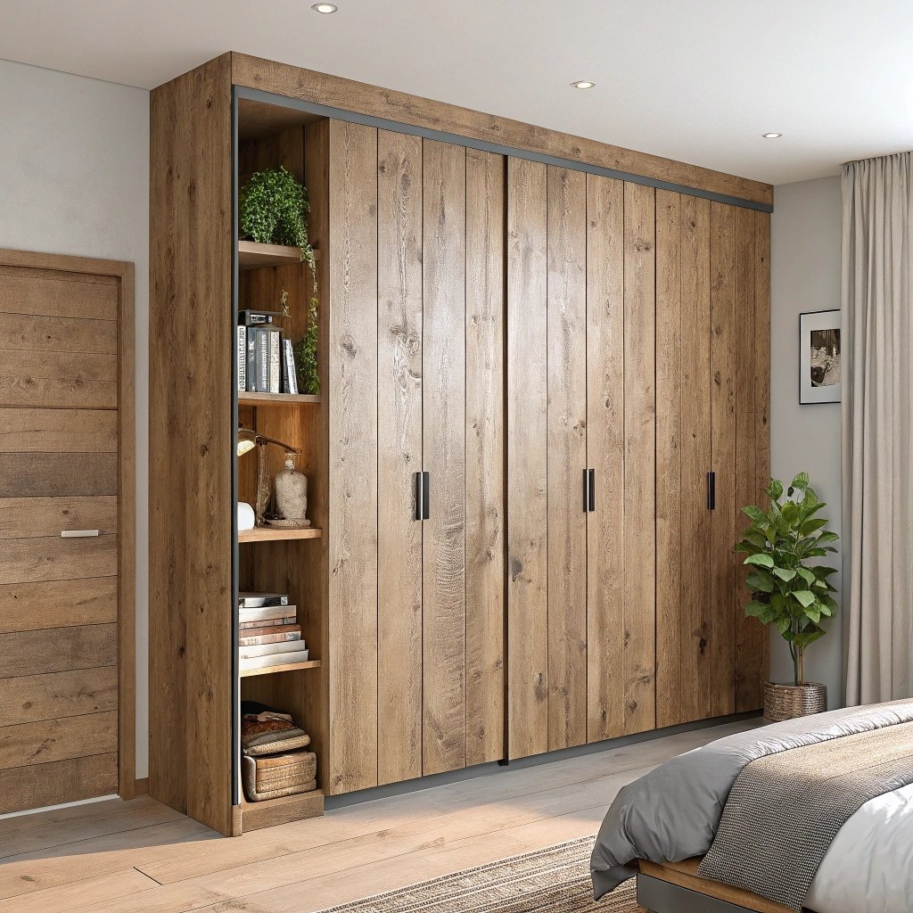 Sustainability adds story and soul. In a “wardrobe design bedroom,” reclaimed wood doors with a clear matte finish pair beautifully with modern interiors, introducing warmth and character. The patina and variation calm the space and make a large storage wall feel crafted rather than monolithic.