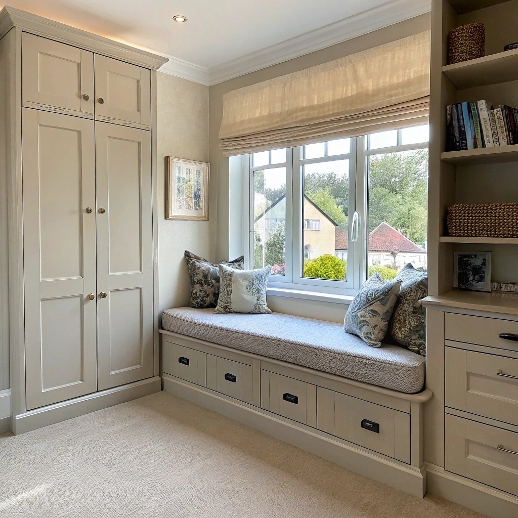 Turn an awkward alcove into a fitted wardrobe and integrate a window seat between tall units. In “wardrobe design bedroom” planning, this move adds storage and a cozy reading nook, making small rooms feel thoughtful and complete.