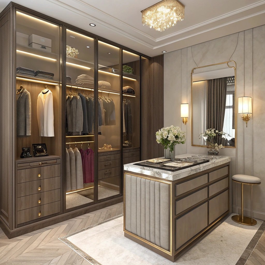 If space allows, bring boutique glamour to the bedroom with a wardrobe wall plus a small island and built-in vanity. This “wardrobe design bedroom” format adds countertop space for folding, a mirror for makeup, and shallow accessory drawers that keep everything visible.