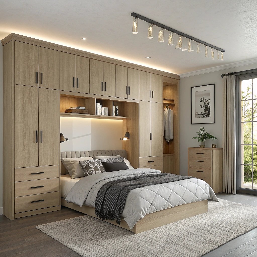 A bridge wardrobe spans over the headboard and continues down both sides, turning unused airspace into storage. This “wardrobe design bedroom” tactic centers the bed and frames it like a custom feature wall. It’s ideal for narrow rooms where you can’t spare a full wall; overhead cabinets hold spare linens while tall side units handle hanging and drawers.