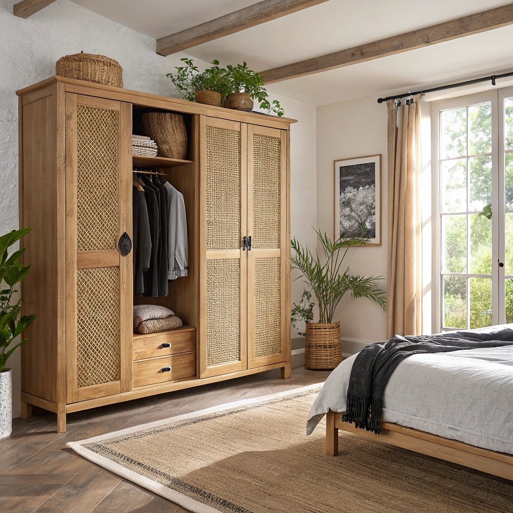 The twist is layered tactility: solid wood frames in light oak, rattan center panels with black fabric backing for opacity, and leather loop pulls for subtle detail. Inside, specify cedar shelves for a natural scent and moth resistance. Finish with a satin hardwax oil for a softly glowing, hand-crafted appearance.