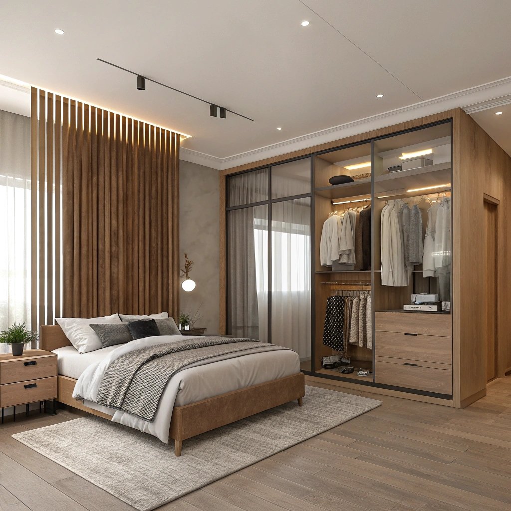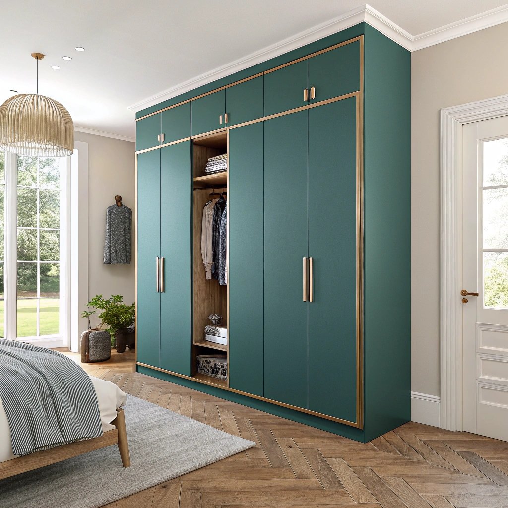 Color brings energy to neutral bedrooms. A color-pop lacquer wardrobe—sage green, deep teal, or muted terracotta—becomes the focal point of a “wardrobe design bedroom.” Balanced with natural linens and warm wood, it reads bold but sophisticated.