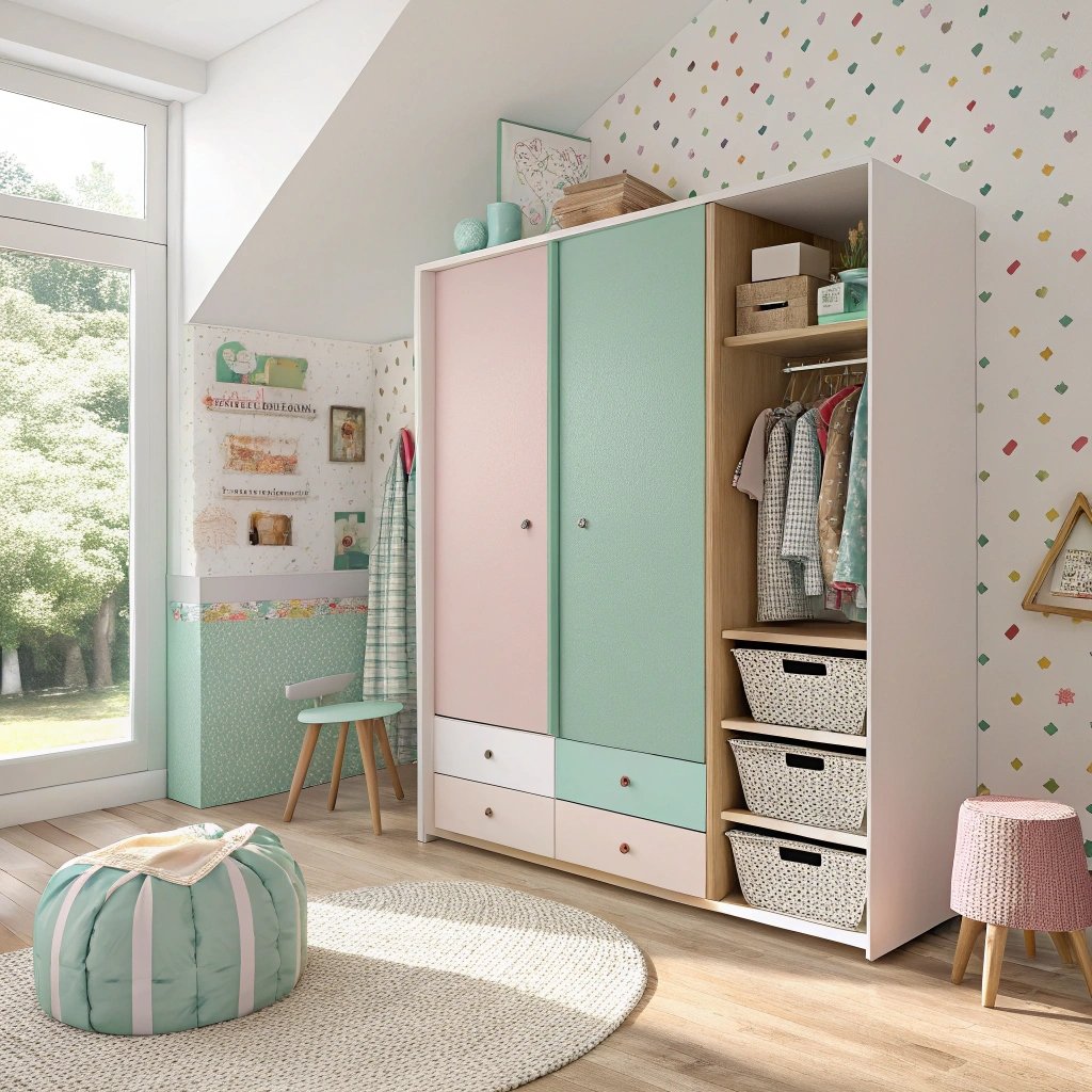 The twist is modularity and safety: rounded handles, soft-close hinges, anti-tip hardware, and anti-slam dampers. Use wipeable lacquer finishes in soft colors and add labels or icon tags on baskets. Internal pegboards and clip-in shelves shift as clothing sizes change, reducing the need to replace the wardrobe as they grow.