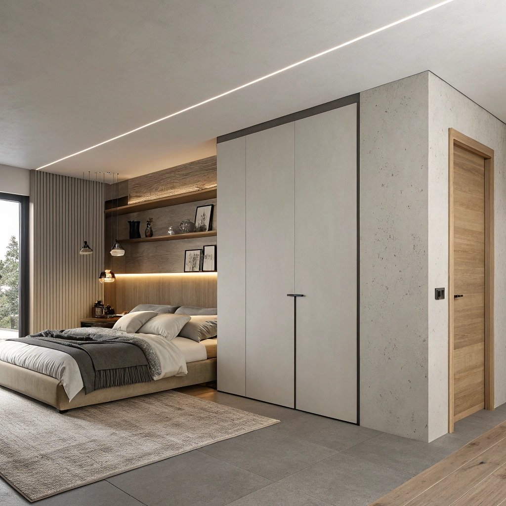Handleless wardrobes with super-matte fronts create a calm, gallery-like backdrop. The lack of hardware reduces visual noise, so the bed and textiles take center stage. In “wardrobe design bedroom” projects focused on serenity, a handleless system (J-pull, push-to-open, or recessed finger rails) is the most discreet way to hide a lot of storage.