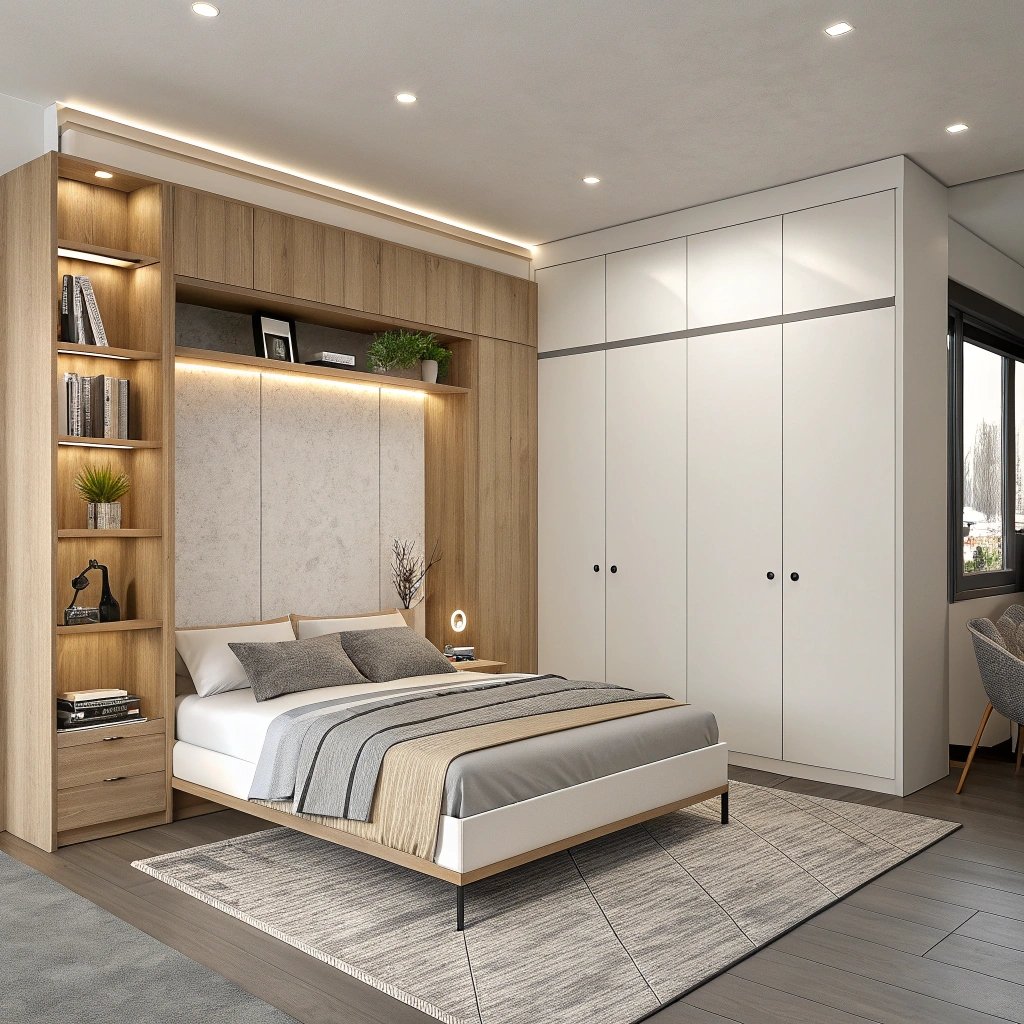 For micro-apartments, merge a wardrobe with a wall bed to reclaim daytime space. In a compact “wardrobe design bedroom” layout, this hybrid solution provides hanging rails, overhead cabinets, and a fold-down bed behind flush panels, maintaining a crisp, uncluttered facade when the bed is stowed.