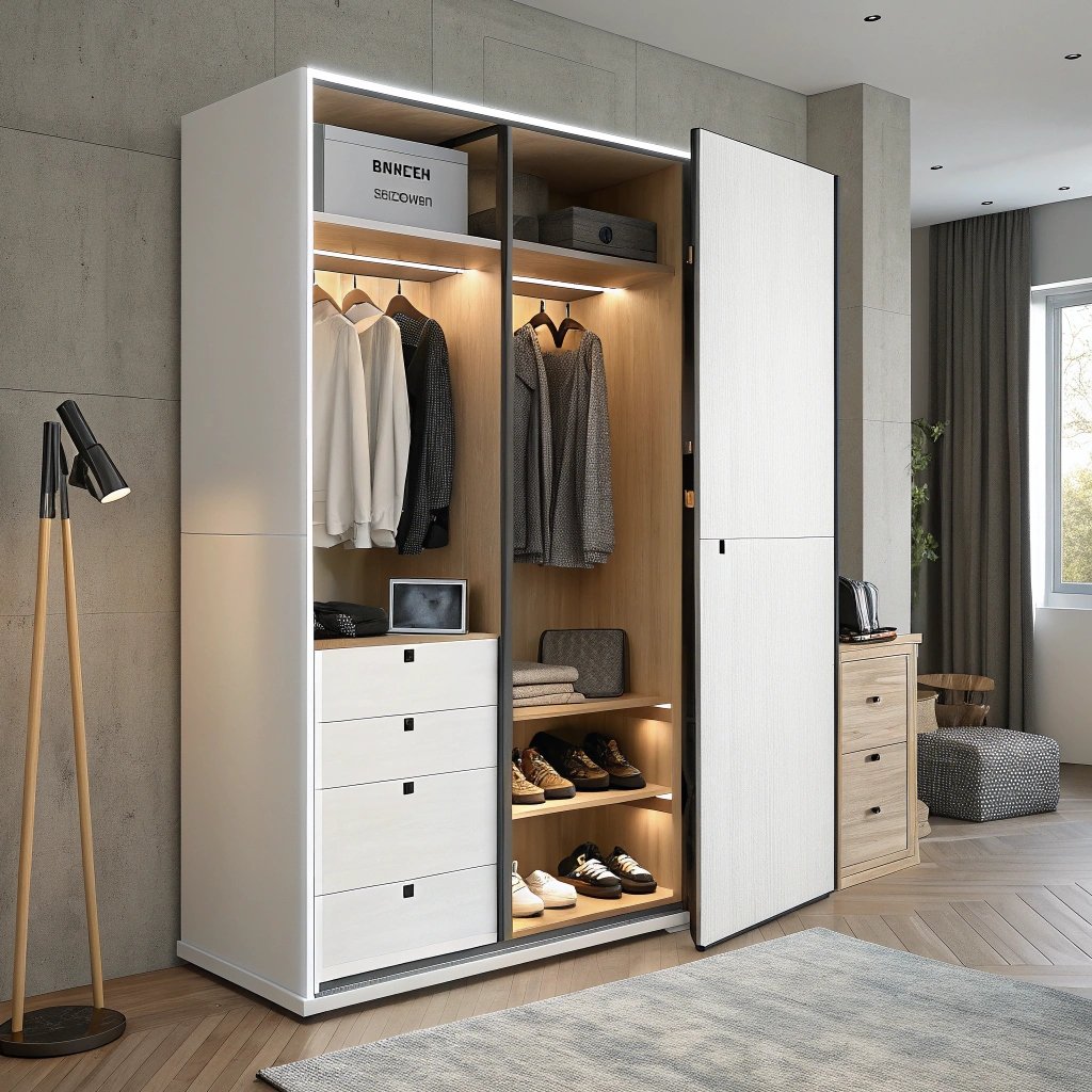 The signature twist is invisible tech: magnetic touch latches, wireless charging pads in a hidden tray, and a small UV-hygiene compartment for gym gear. Tie lighting to a dimmable smart system so brightness changes from night to morning routines. The wardrobe looks minimalist outside while quietly doing more inside.