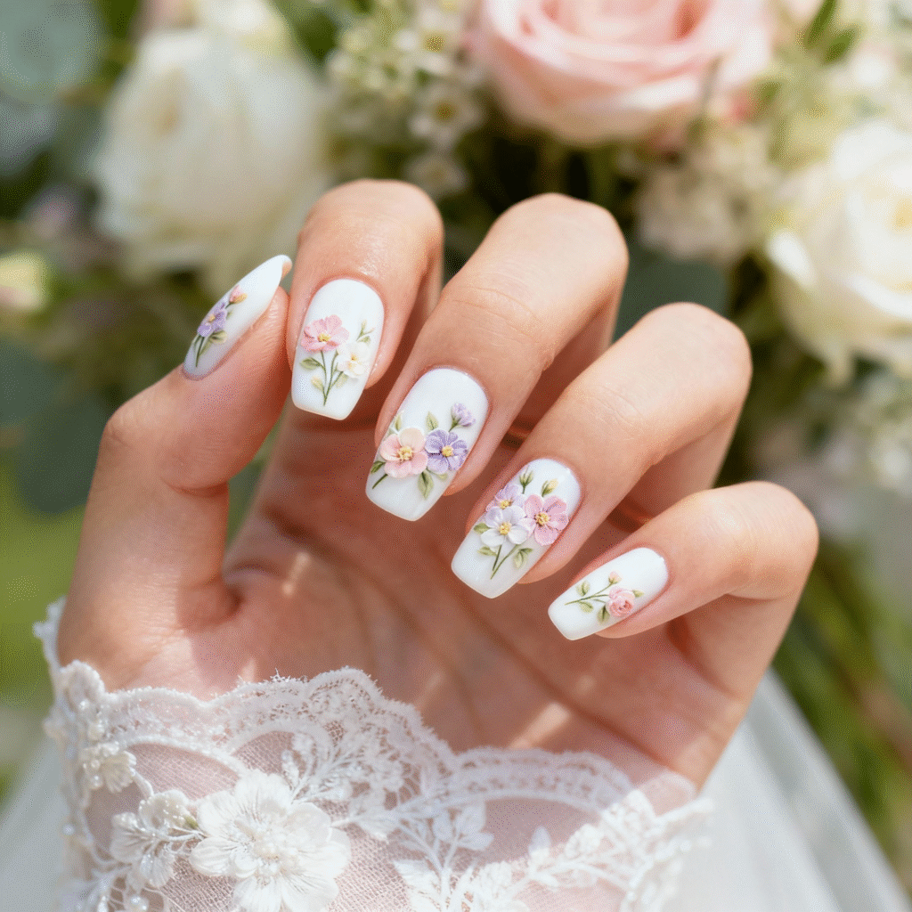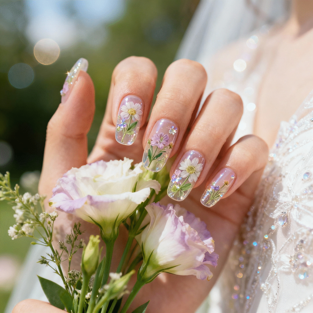 Floral pressed nails capture the beauty of real or painted flowers encased in clear polish. This design brings a touch of nature to your bridal aesthetic, evoking romance and softness perfect for spring or outdoor weddings.