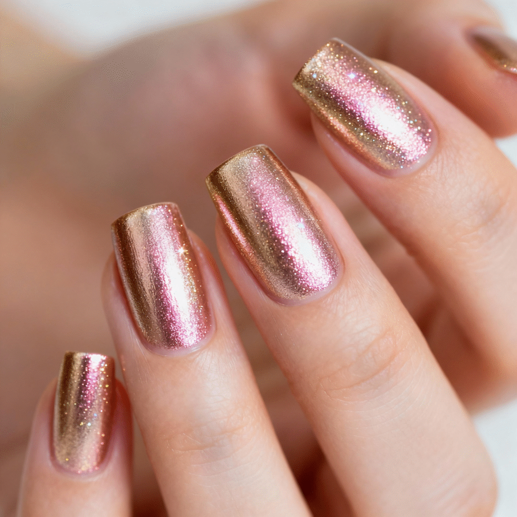 - Brush on a layer of rose gold shimmer polish evenly across each nail.