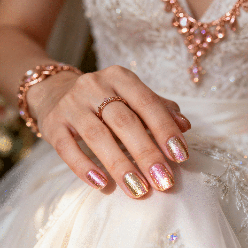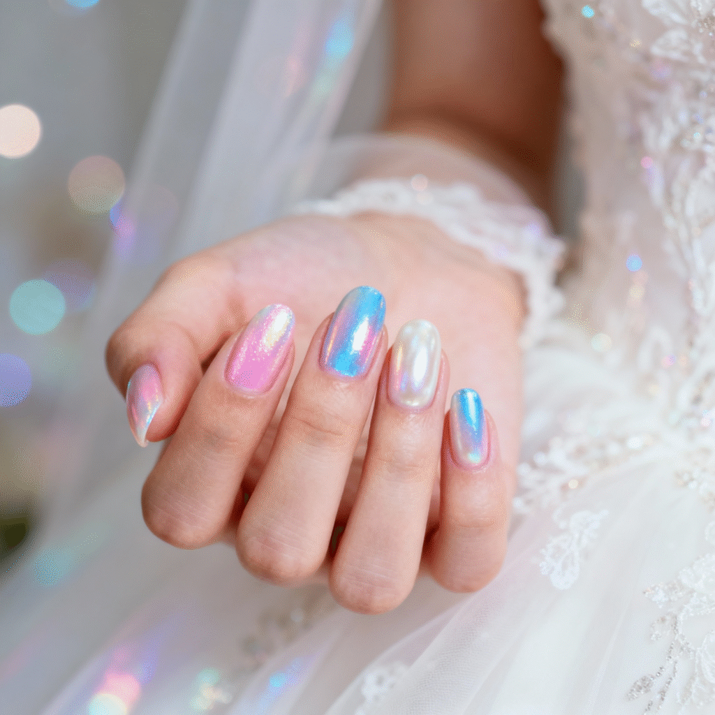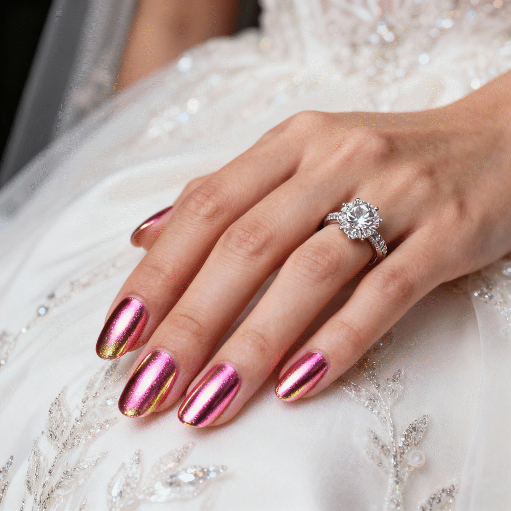 Iridescent pink chrome nails reflect light in shimmering tones of rose, pearl, and gold. This radiant look enhances the bride’s glow and feels effortlessly luxurious.
