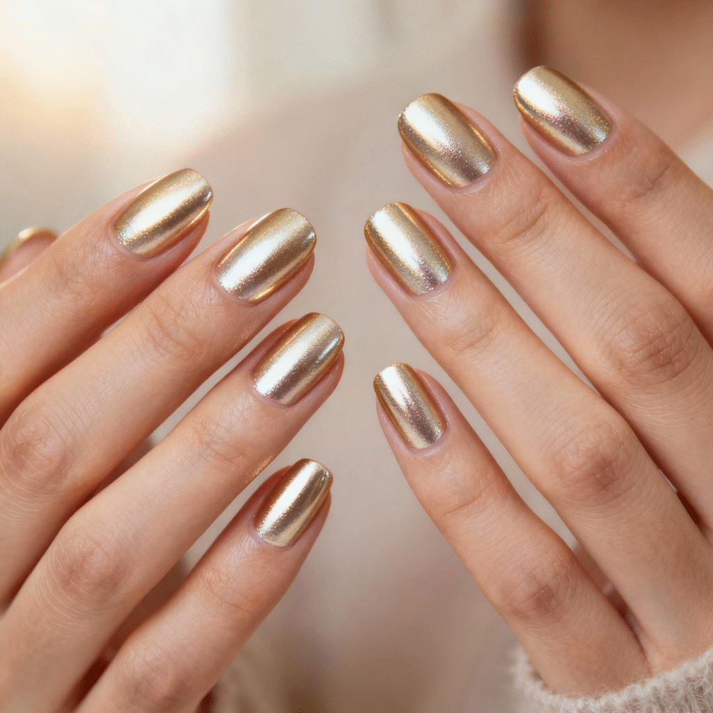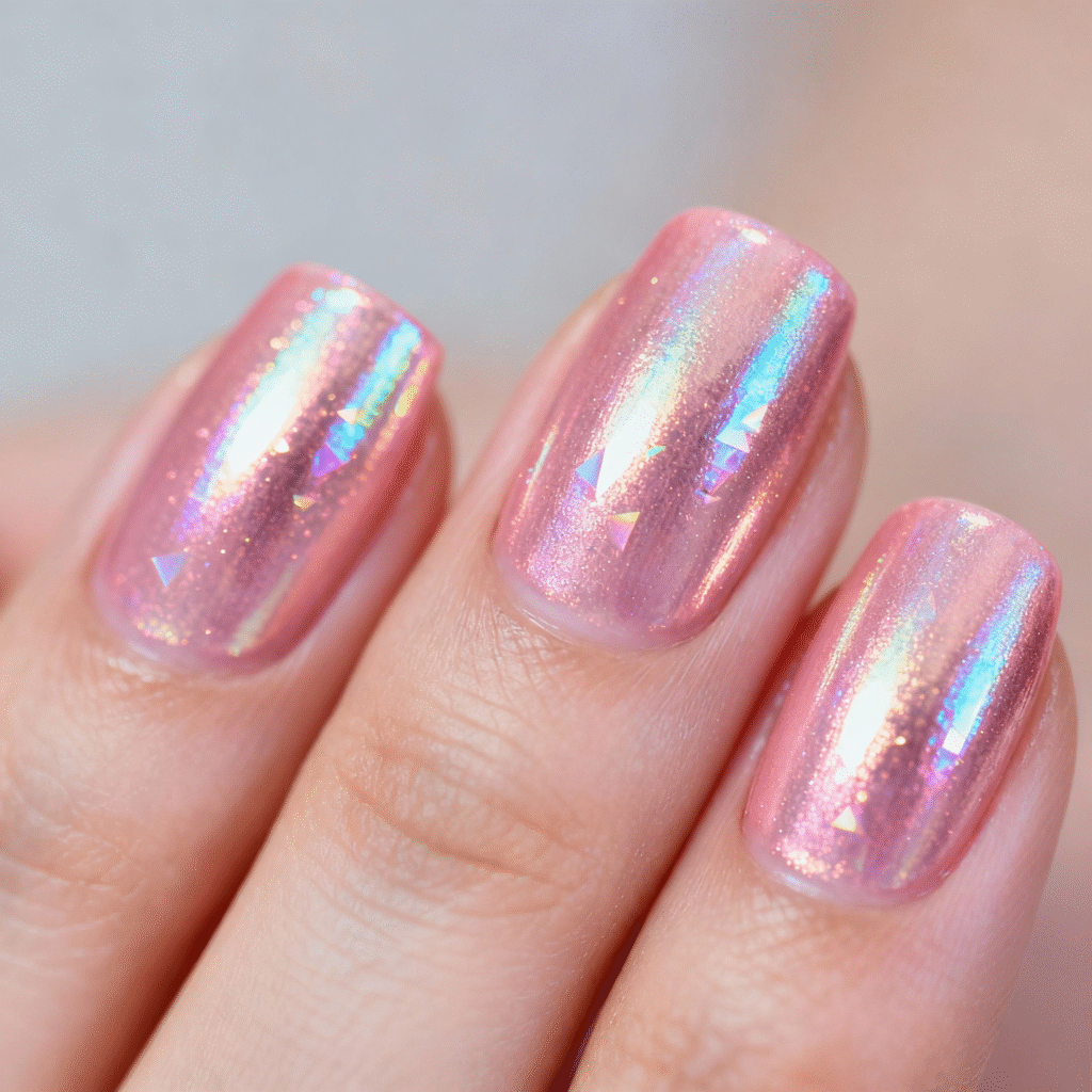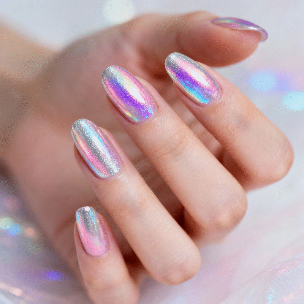 Iridescent pink chrome nails reflect light in shimmering tones of rose, pearl, and gold. This radiant look enhances the bride’s glow and feels effortlessly luxurious.
