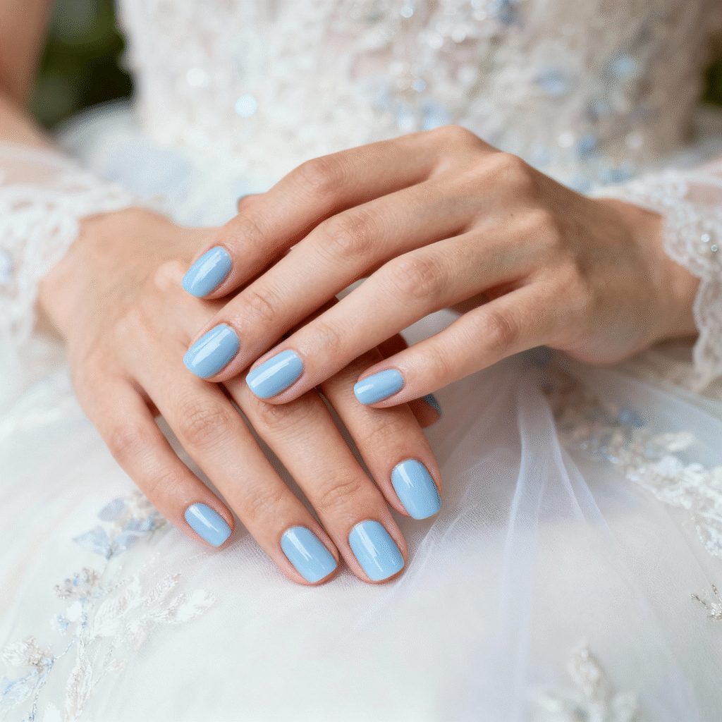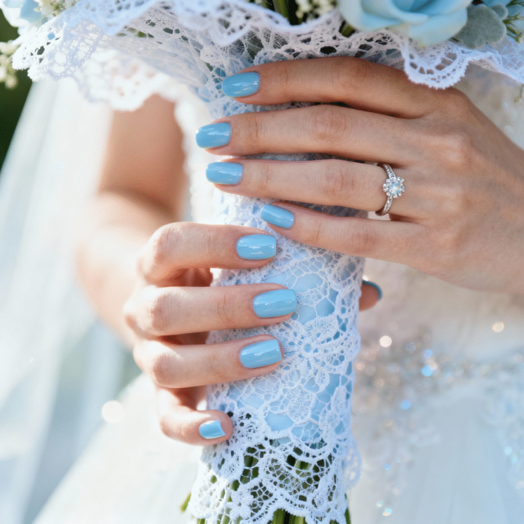 This design blends tradition and modernity beautifully. The “something blue” element is reimagined with a chic pastel polish, making it a stylish yet meaningful detail that completes your wedding day symbolism.