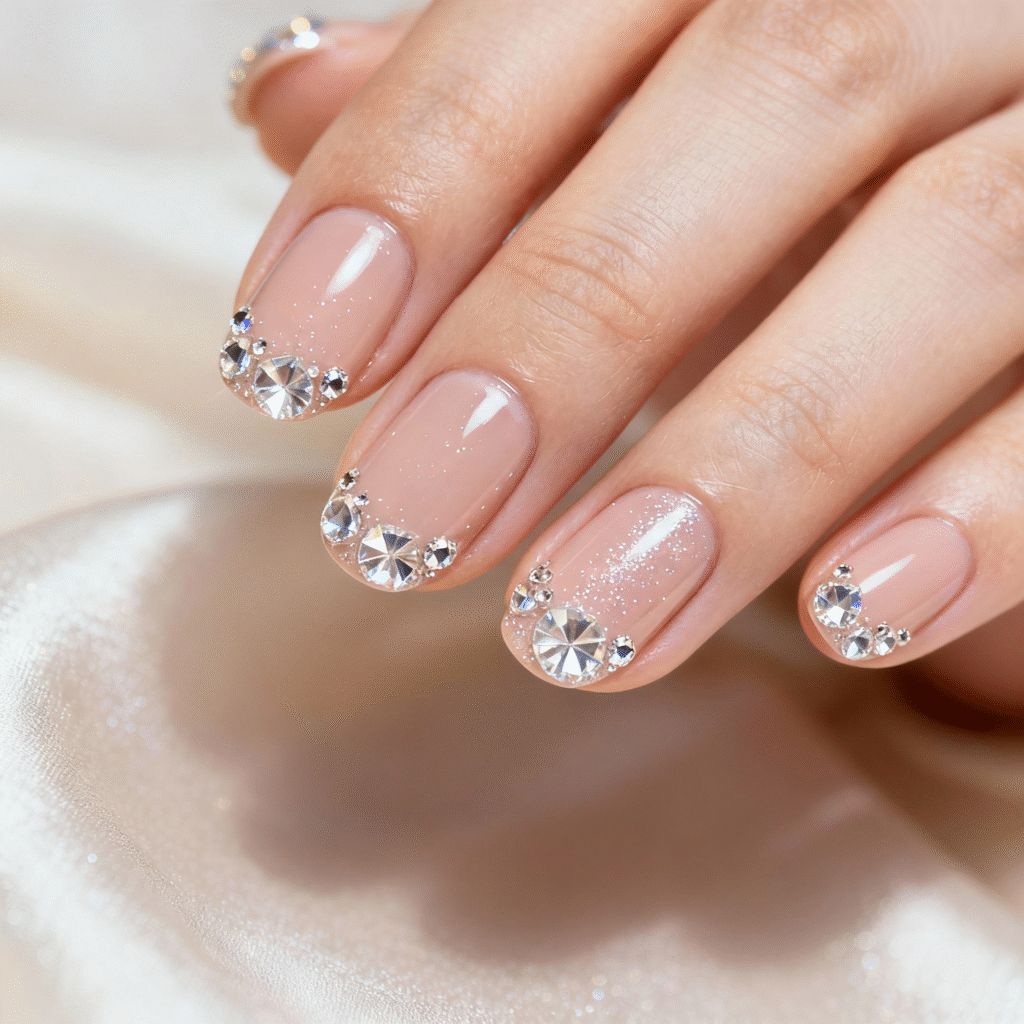 The combination of simplicity and sparkle makes this look stand out without being overwhelming. Each crystal catches light beautifully, creating a dazzling effect that elevates your bridal manicure instantly.