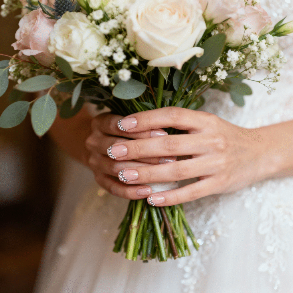 This sophisticated design keeps the nails natural with a nude tone while adding rhinestones along the cuticle line. It’s minimal yet luxurious, perfect for brides who want elegance with a touch of sparkle.