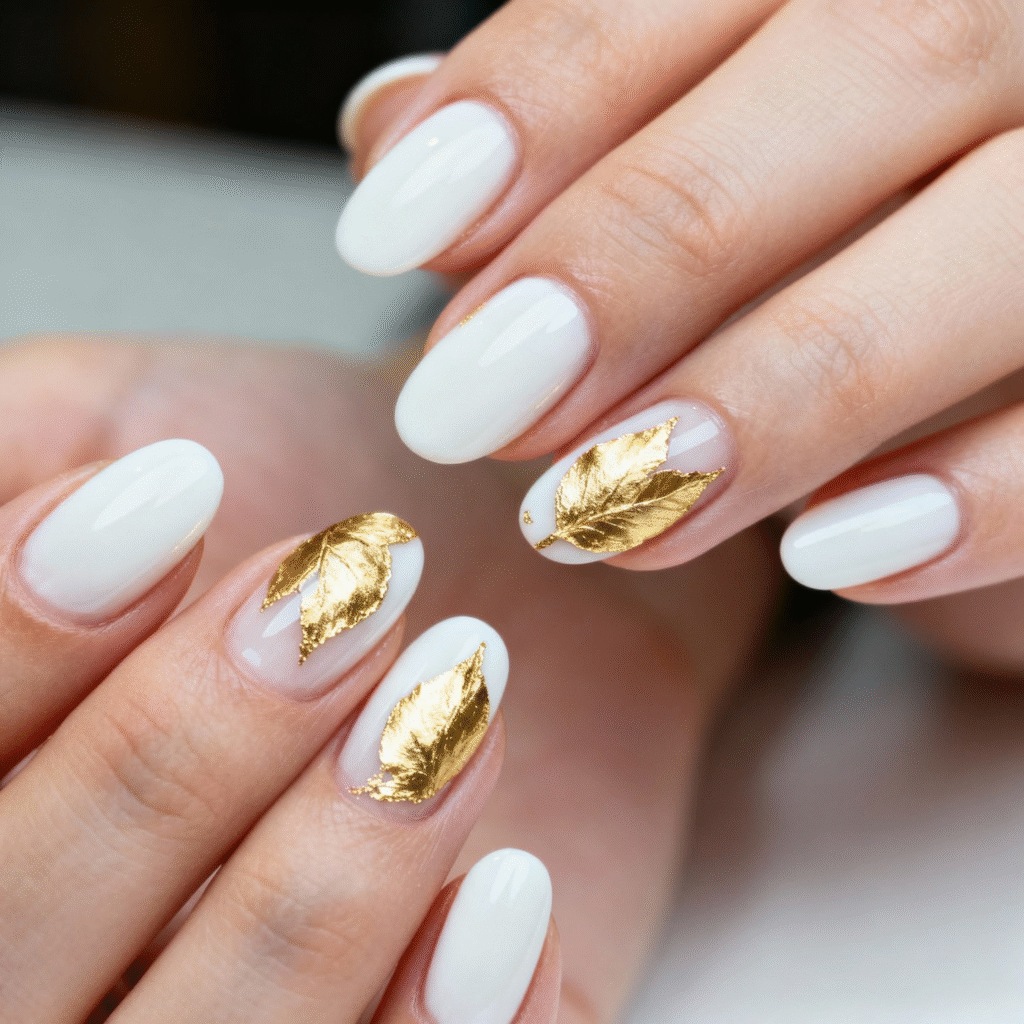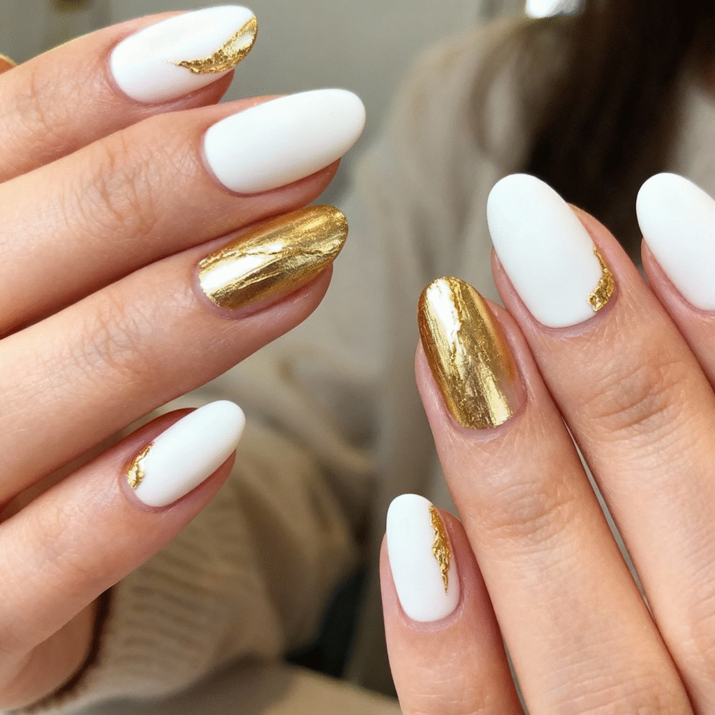 This design merges the purity of white polish with the glamour of gold leaf accents. The artistic gold flakes stand out against the clean background, creating a balance of modern and regal.