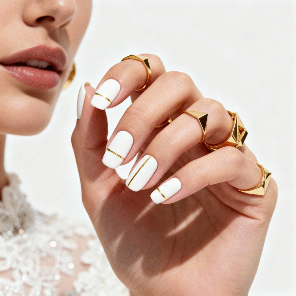 Matte white nails paired with thin gold details create a clean yet regal bridal look. The contrast between soft matte and metallic lines adds sophistication and a modern touch to a classic color palette.