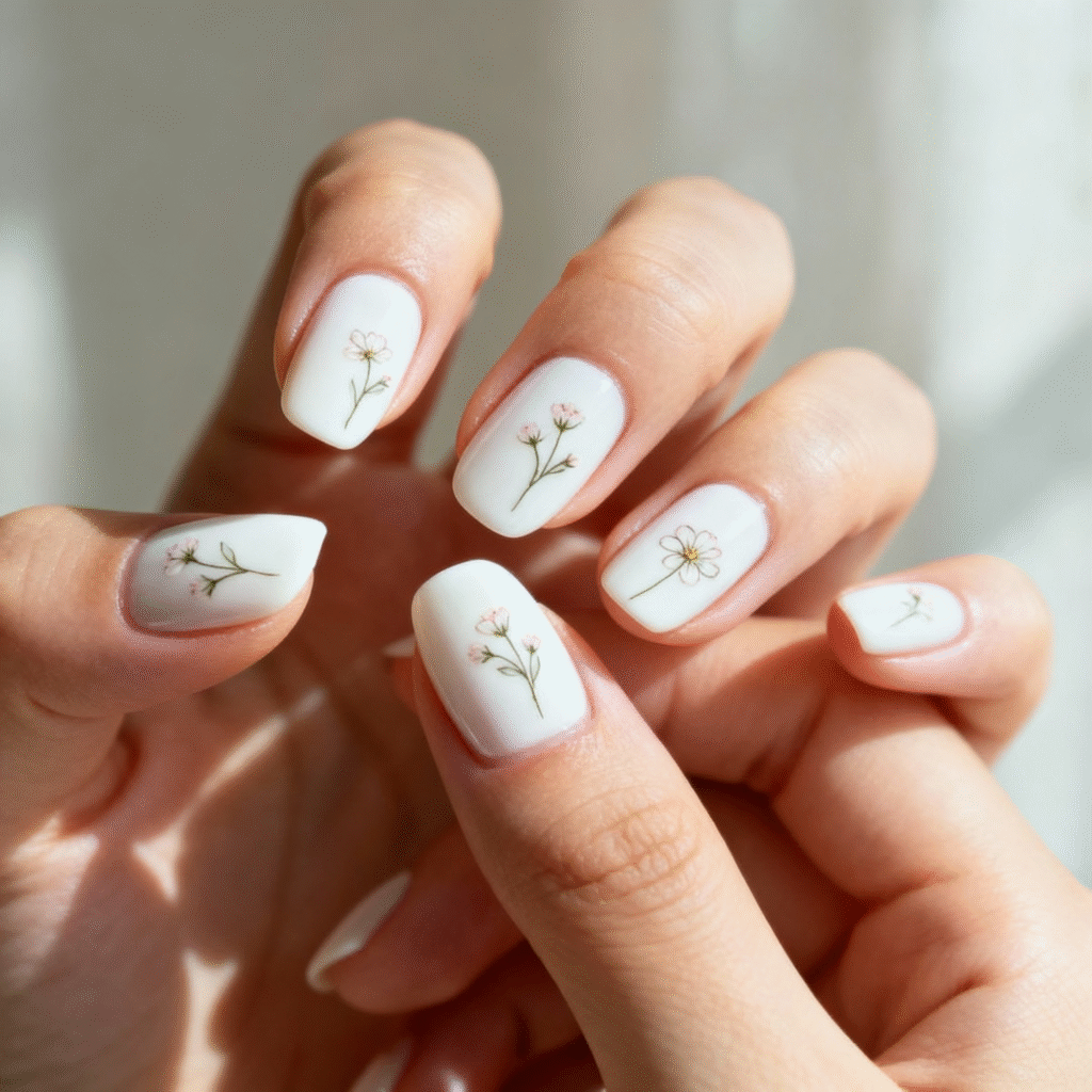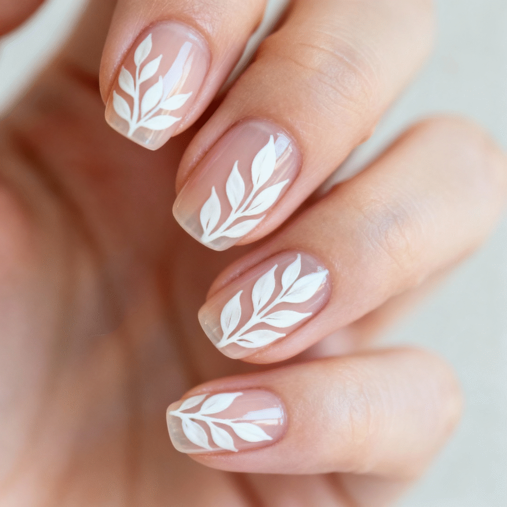 Each leaf pattern can be hand-painted, giving every nail its own character. The subtle white-on-nude palette ensures the look remains elegant and organic, ideal for garden or bohemian-style brides.