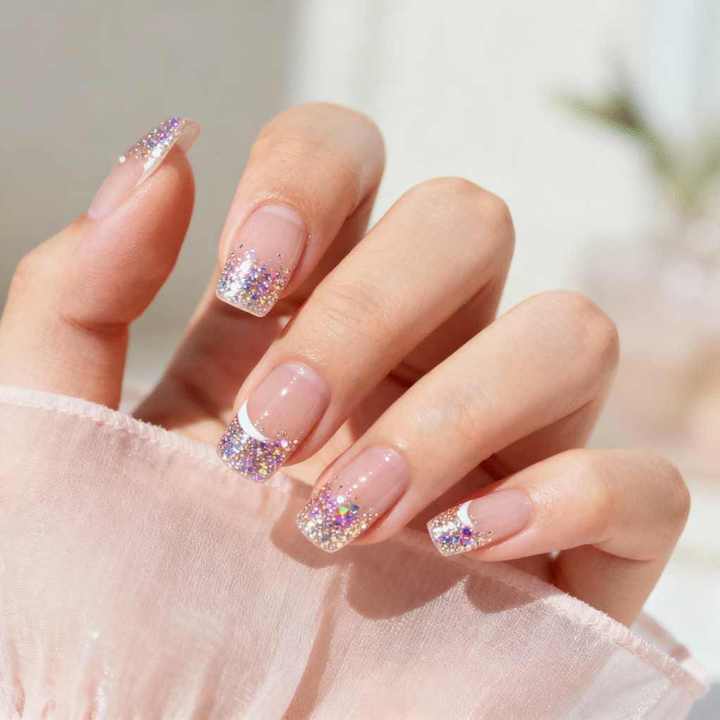 - Dab glitter polish at the tips using a sponge for gradient blending.