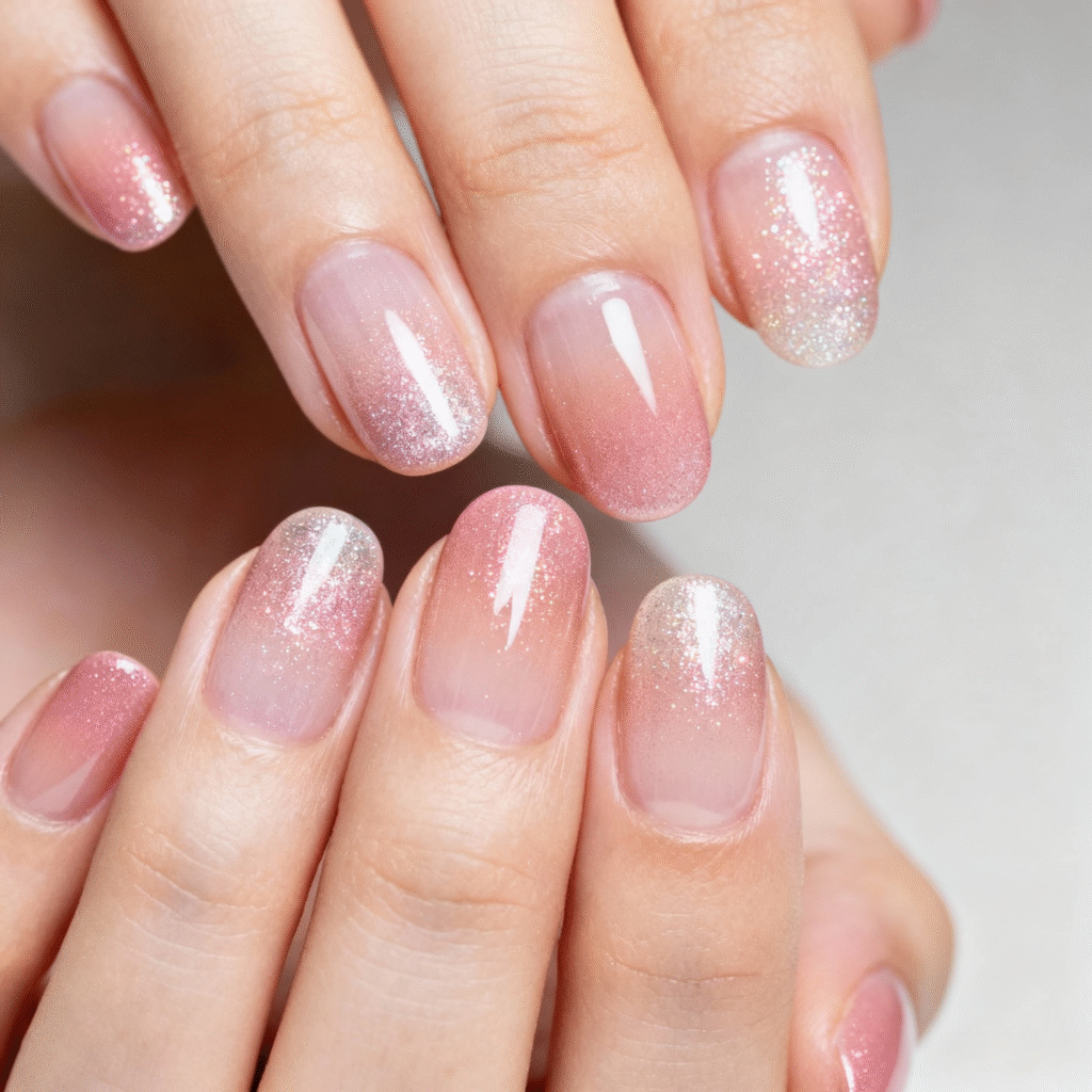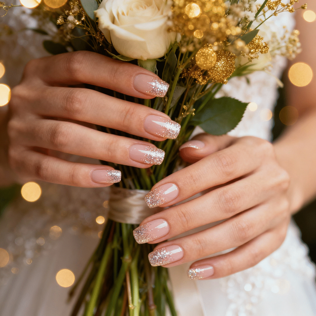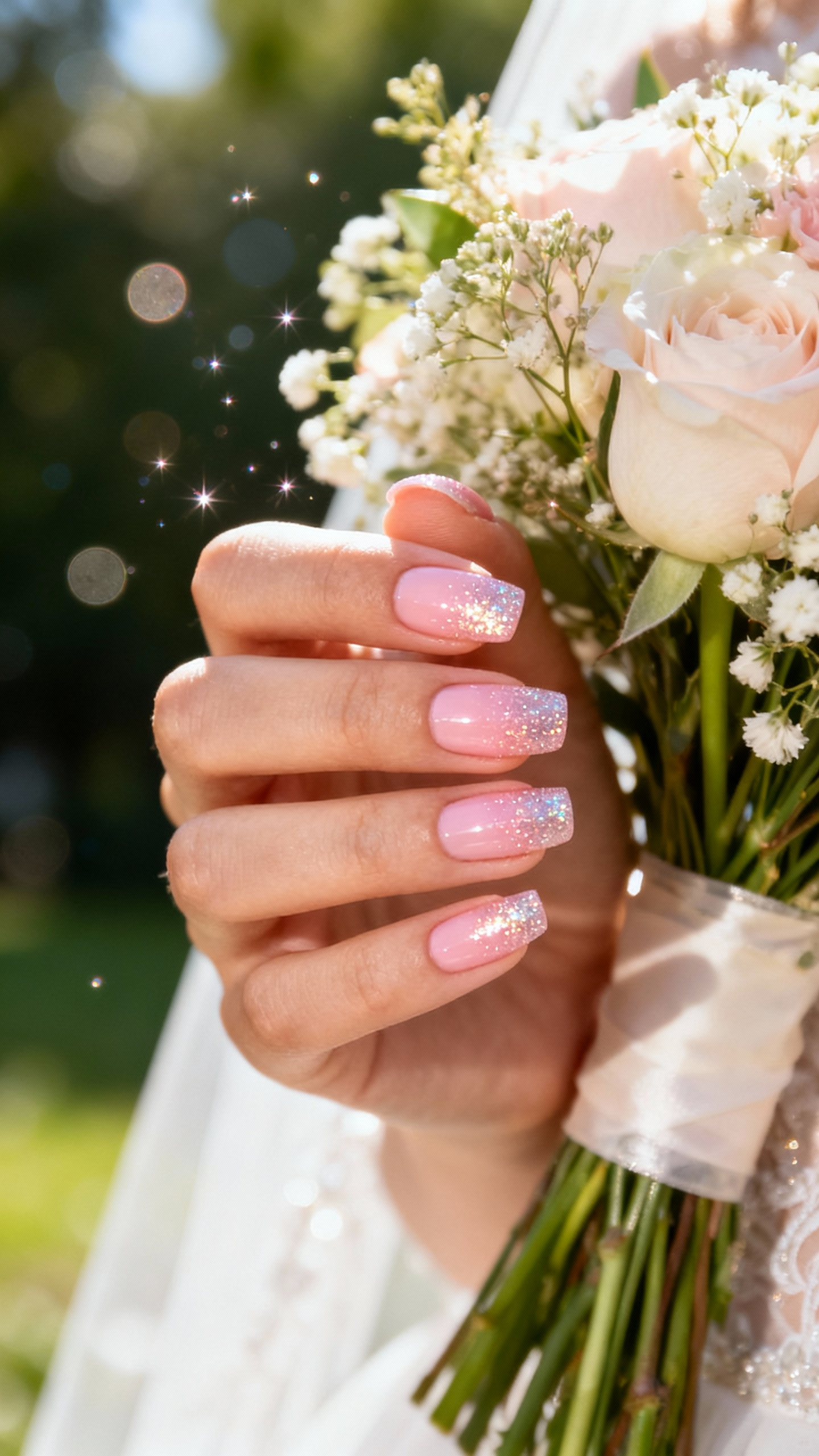 This soft, romantic design blends delicate blush tones with a subtle gradient of glitter. It’s ideal for brides who want a hint of sparkle without being too bold. The shimmer captures the light beautifully, adding a dreamy glow to your hands in every photo.