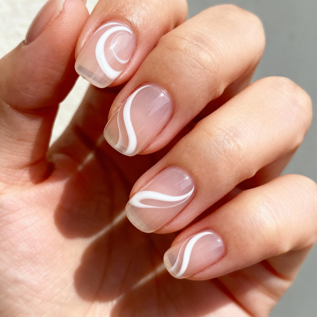 Nude nails with fine white leaf art evoke natural beauty and soft femininity. The design mimics delicate leaves flowing gracefully across each nail, symbolizing growth and new beginnings—perfect for weddings.