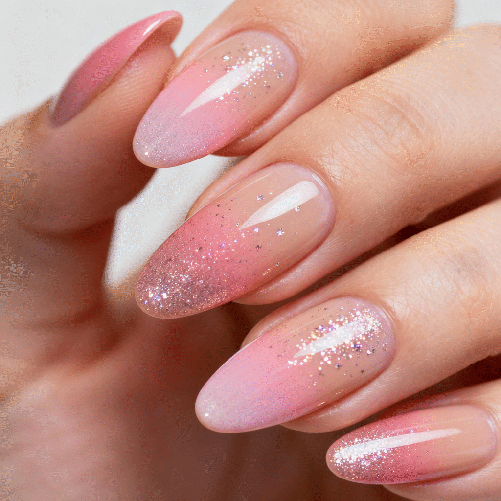 The fade effect creates a natural transition from solid color to sparkle, symbolizing elegance and joy. It’s a favorite for outdoor weddings or receptions where lighting enhances the subtle glimmer. The soft pink hue also complements a variety of skin tones effortlessly.